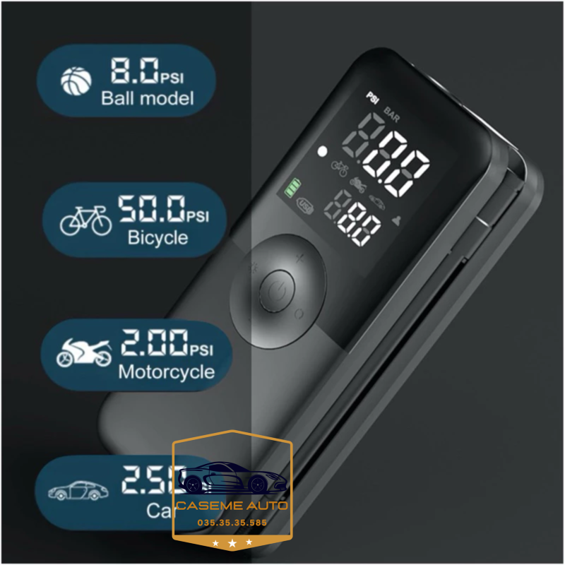 Máy Bơm Không dây, nhẹ và di động, máy bơm này rất dễ sử dụng. Với bốn chế độ cài đặt áp suất có thể lập trình trước, nó sẵn sàng bơm hơi lốp xe