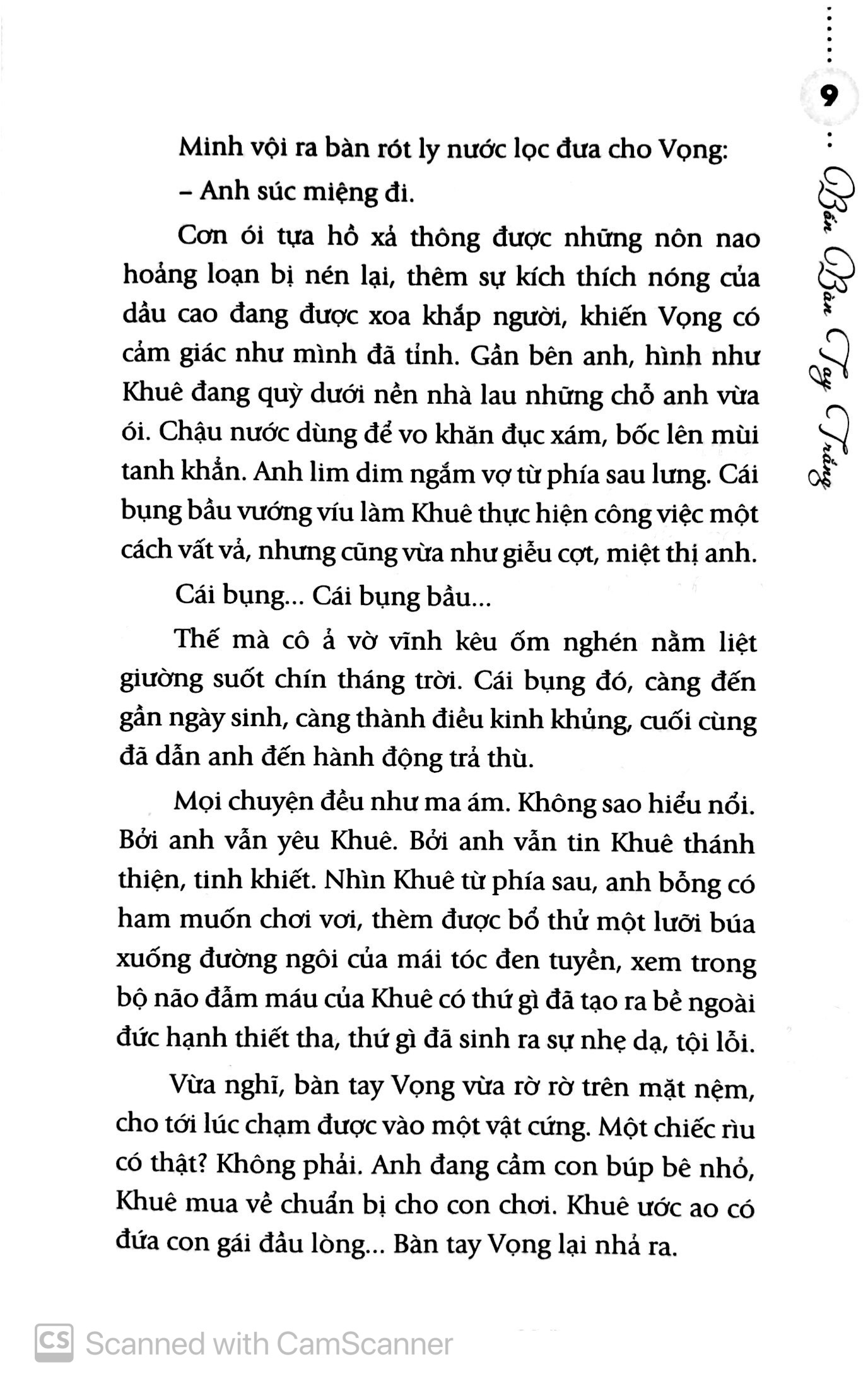 Mua tại Tiktok'Mọi chuyện đều như ma ám. Không sao hiểu nổi. Bởi anh vẫn yêu Khuê. Bởi anh vẫn tin Khuê thánh thiện, tinh khiết. Nhìn Khuê từ phía sau, anh bỗng có ham muốn chơi vơi, thèm được bổ thử một lưỡi búa xuống đường ngôi của mái tóc đen tuyền, xem trong bộ não đẫm máu của Khuê có thứ gì đã tạo ra bề ngoài đức hạnh thiết tha, thứ gì đã sinh ra sự nhẹ dạ, tội lỗi.