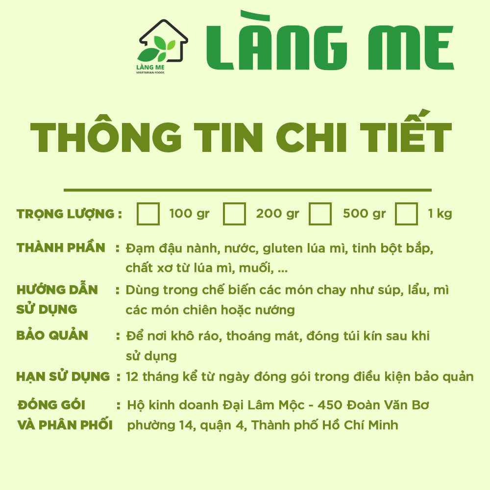 - Thực phẩm chay Làng Me làm từ 100% đậu nành, nước, lúa mì, tinh bột bắp,