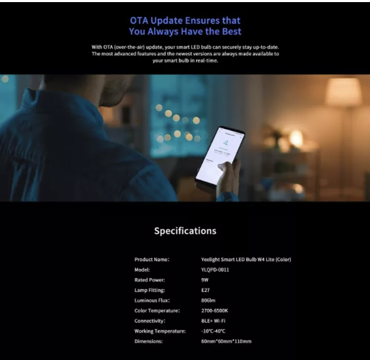 Bóng đèn Yeelight Color W3 sử dụng cấu trúc quang học chuyên nghiệp, với các bộ phận LED chất lượng cao. Những thứ này đảm bảo nguồn sáng ổn định. Bảo vệ mắt liên tục và ngăn ngừa nhấp nháy. Độ sáng có thể điều chỉnh có nghĩa là bạn có thể định cấu hình lượng ánh sáng phù hợp cho bất kỳ ngữ cảnh nào. Kết hợp nhiệt độ màu có thể được điều chỉnh trong khoảng từ 1700K đến 6500K.
