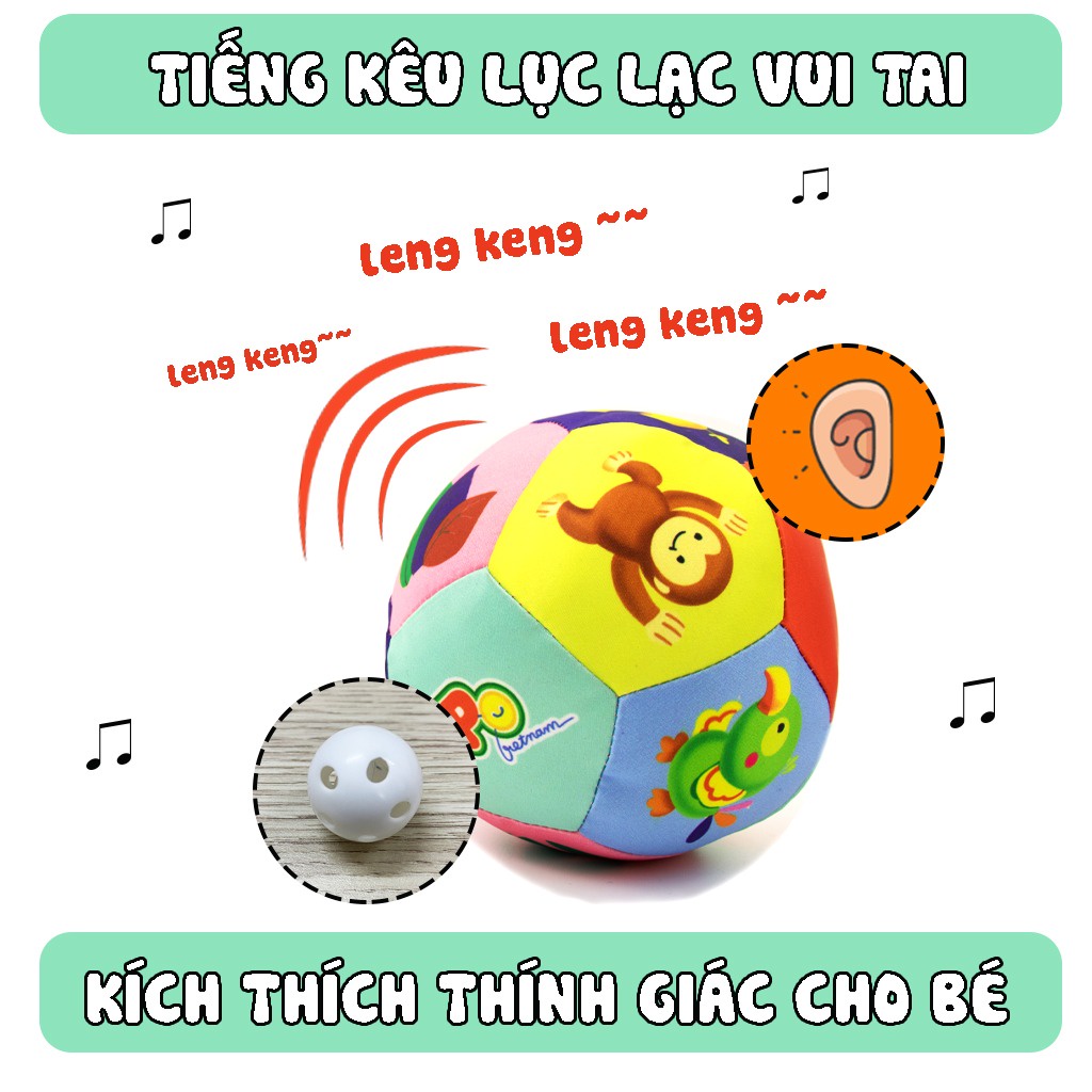 - Bóng có kèm chuông xúc xắc bên trên, kích thích thính giác cho bé và tạo cho bé hứng thú khi chơi