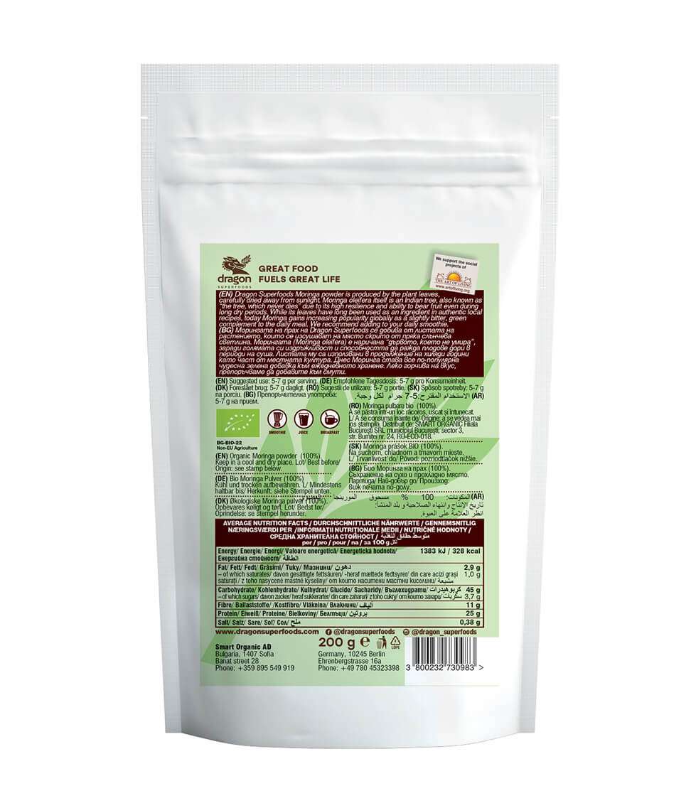 Mua tại TiktokChứng nhận hữu cơ Châu Âu Chứng nhận hữu cơ của sản phẩm bởi BG-BIO-22 ️Nhà phần phối: Smart Organic ️Thương hiệu: Smart Organic ️Xuất xứ: Bulgaria Bột chùm ngây hữu cơ Dragon Superfoods được sản xuất bằng lá cây, được sấy khô cẩn thận, tránh ánh sáng mặt trời. Cây chùm ngây là một loài cây của Ấn Độ, còn được gọi là “cây không bao giờ chết” do khả năng phục hồi cao và có khả năng kết trái ngay cả trong thời gian khô hạn kéo dài. Trong khi lá của nó từ lâu đã được sử dụng như một thành phần trong các công thức nấu ăn địa phương, ngày nay chùm ngây ngày càng trở nên phổ biến trên toàn cầu như một loại thực phẩm bổ sung có vị hơi đắng. Bột chùm ngây Dragon Superfoods được sản xuất bằng lá cây chất lượng cao.