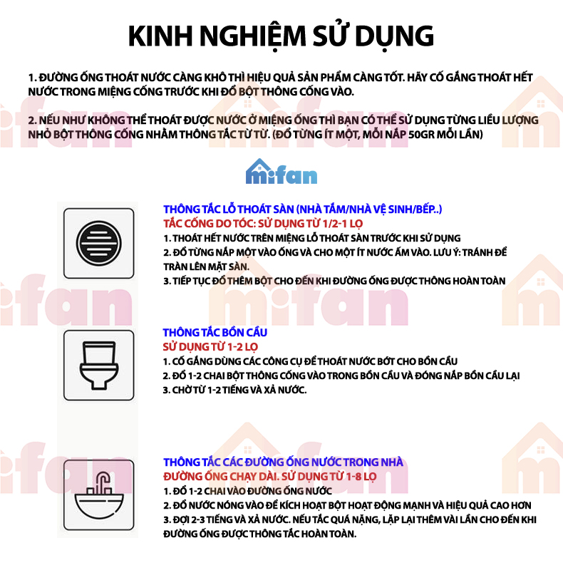 ️LƯU Ý️ Nếu chỗ nghẽn quá nhiều nước quí khách vui lòng múc bớt nước trước khi đổ bột vào vì quá nhiều nước thì đỗ vào bột sẽ bị pha loãng đi sẽ đem lại hiểu quả xử lý không như mong muốn Không được pha bột với nước , chỉ đổ bột trực tiếp vào chỗ nghẹt, nếu lỗ nhỏ có thể gấp giấy thành dạng phễu để đổ, tránh bột không vào được chỗ nghẹt. Trong lúc bột đang phân hủy chất cặn bã, tránh xả nước để không làm bột thông cống bị trôi đi hết, mất tác dụng của bột nhé.