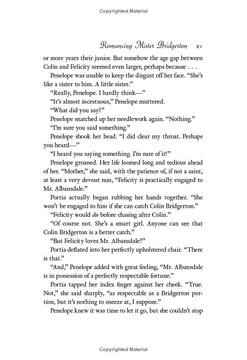 Colin Bridgerton is tired of being thought of as nothing but an empty-headed charmer, tired of the notorious gossip columnist Lady Whistledown, who can’t seem to publish an edition without mentioning him. But when Colin returns to London from a trip abroad, he discovers nothing in his life is quite the same—especially Penelope Featherington! The girl who was always simply there is suddenly the girl haunting his dreams. When he discovers that Penelope has secrets of her own, this elusive bachelor must decide . . . is she his biggest threat— or his promise of a happy ending?