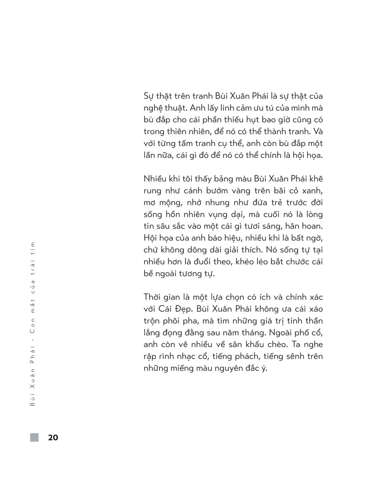 Quyển sách mà bạn đang cầm trên tay là một tuyển tập bao gồm 25 bài viết về hội họa Bùi Xuân Phái của 14 nhà nghiên cứu và phê bình, nhà sưu tập tranh, văn nghệ sĩ nổi tiếng trong nước và nước ngoài. Mỗi người nhìn tranh ông và cuộc đời ông dưới một góc độ khác nhau, đem lại cho chúng ta những cảm nhận và hiểu biết rất mới mẻ và phong phú. Các bài viết được in kèm tranh Bùi Xuân Phái, với số lượng lên đến hơn 165 tác phẩm. Còn chờ gì nữa, bạn hãy khám phá những câu chuyện, những khảo cứu rất hấp dẫn và sâu sắc về hội họa Bùi Xuân Phái cũng như cuộc đời danh họa.