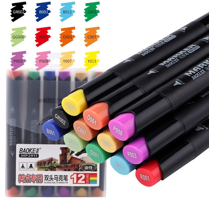 Bút màu Marker BAOKE MP2911 có các đặc điểm sau: - Màu sắc sặc sỡ - thiết kế 2 đầu bút - Một đầu chuyên dùng để vẽ, 1 đầu chuyên dùng để tô. Ngoài