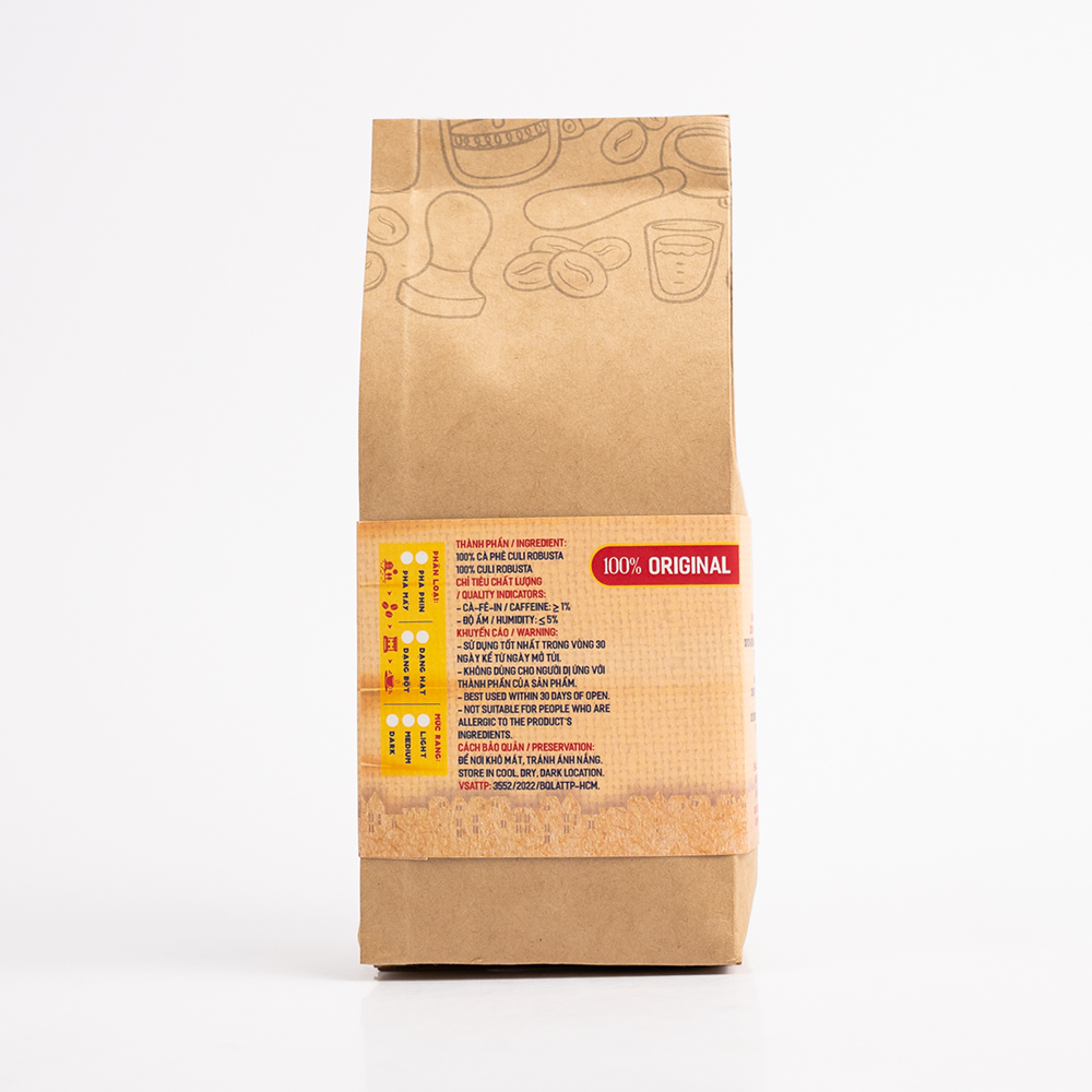 - Sản phẩm được đóng gói bằng tui ZIP cao cấp, có van thoát khí 1 chiều hỗ trợ bảo quản hạt (bột) cafe bên trong