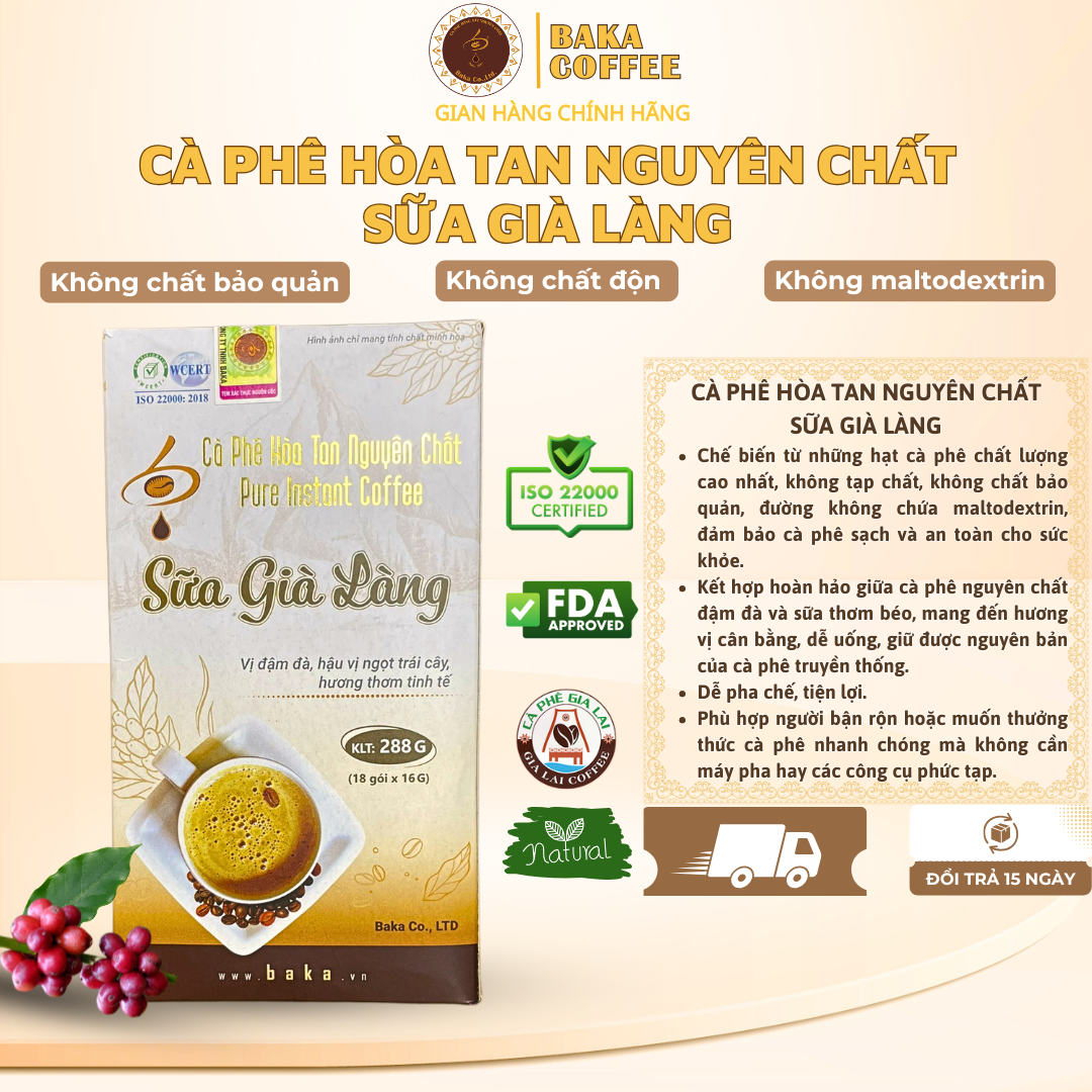 Cà Phê Hòa Tan Nguyên Chất SỮA GIÀ LÀNG - Hộp 18 gói - Sản phẩm làm từ cà phê nguyên chất, không sử dụng chất độn, không sử dụng đường Maltodextrin. - Nguyên liệu