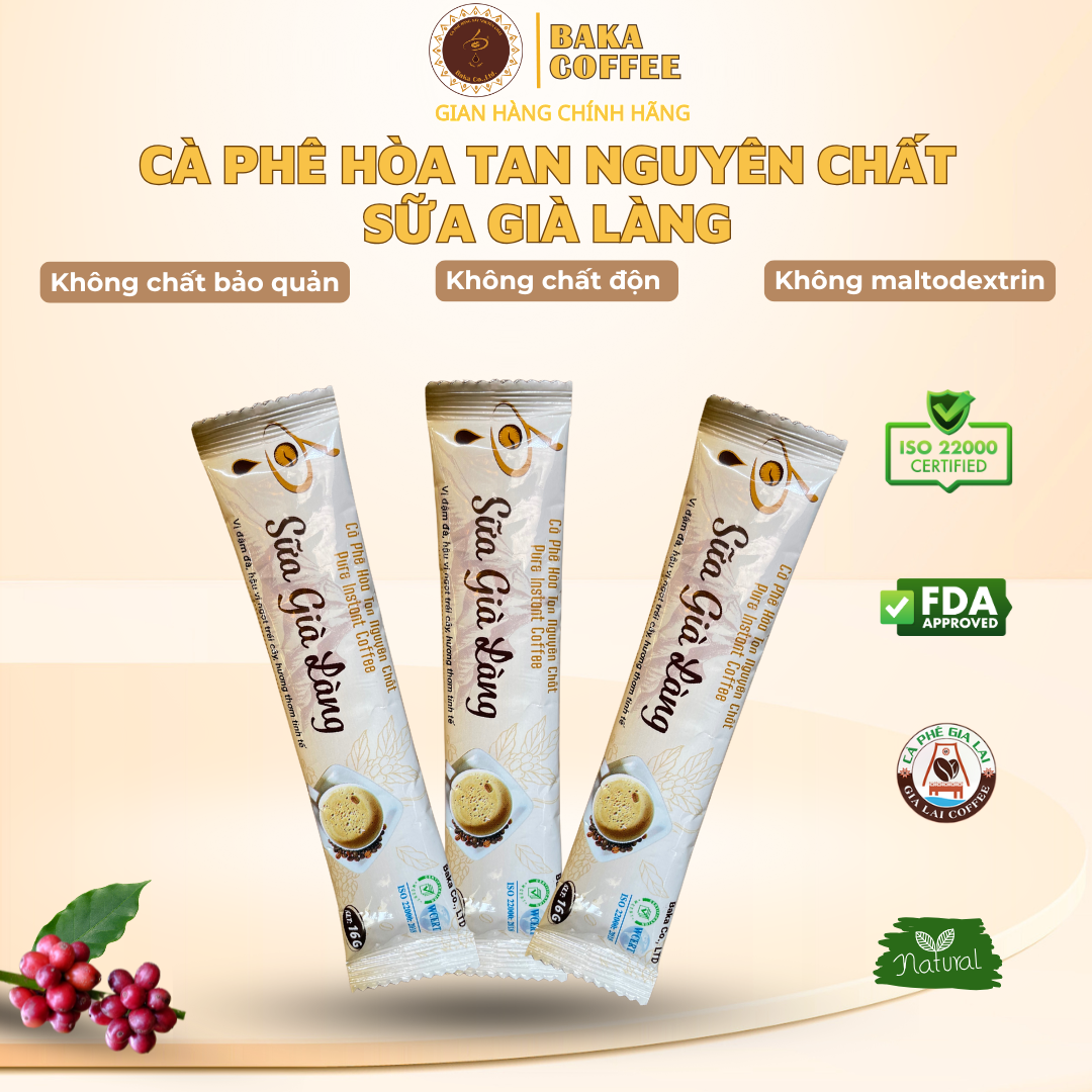 Cà Phê Hòa Tan Nguyên Chất SỮA GIÀ LÀNG - Bì Zip - Sản phẩm làm từ cà phê nguyên chất, không sử dụng chất độn, không sử dụng đường Maltodextrin. - Nguyên liệu được