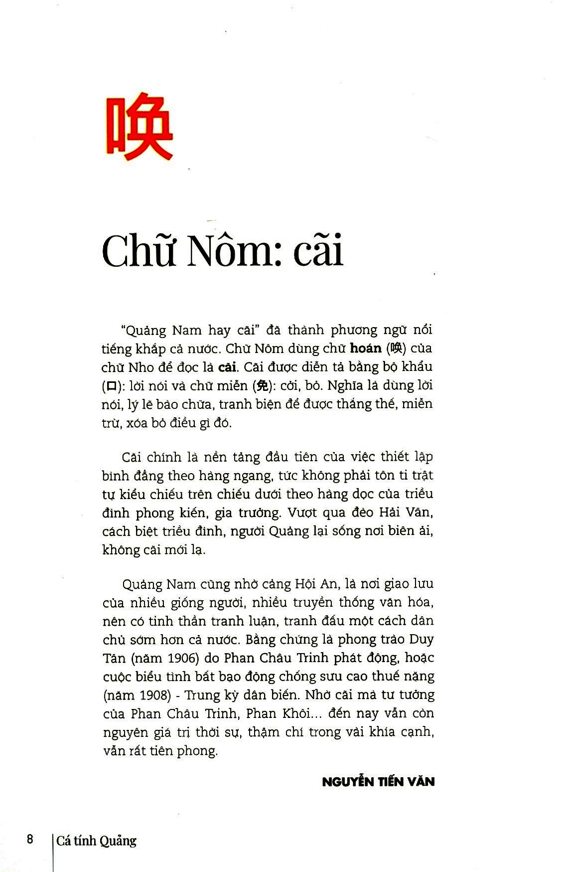 Cá Tính Quảng Xứ Quảng trong lịch sử đã là sự chung sống của Chăm-Việt, là cửa ngõ của giao thuơng quốc tế với nhiều bến cảng lớn, nơi Hội An là thành phố toàn cầu từ thời phong kiến, nên tinh thần dân chủ, việc chấp nhận sự khác biệt đã thành bản sắc. Như là một tiếp nối, các nhân vật trong sách này cũng được chọn lựa với tinh thần bình đẳng và dân chủ như vậy. Trong công việc riêng, mỗi nhân vật có những đóng góp, những gợi hứng đáng trân quý, các tác giả dựa vào đó để viết về họ, chứ không có ý phân “chiếu trên, chiếu dưới”. Thật vậy, tự trong mỗi ngành nghề thì còn có thể bàn về chuyện cao thấp, lớn nhỏ, chứ cà một xứ sở, một vùng văn hóa, với lịch sử dài và phức tạp, đâu dễ để nhận định ai quan trọng ai tầm thường, ai lớn ai nhỏ. Mà nếu thật sư muốn phân cao thấp, thì tiêu chí nào có thể phù hợp và công bằng với các ngành nghề, các xuất phát điểm quá khác nhau. Chính vì vậy, khi đọc sách, nếu độc giả thích nhân vật A hơn B, hoặc thấy c lớn lao hơn D, ấy cũng là bình thường, là cảm nhận riêng, chứ tự cuốn sách không hướng đến điều đó. Nhiều bài trong sách này từng được in trên báo và tạp chí, nay tác giả tự nhuận sắc để góp mặt trong tuyển tập này. Một vài bài in theo sự lựa chọn, biên tập của chính nhân vật trong bài. Sách với bìa và cover từng phần do họa sĩ Lê Kinh Tài thiết kế, biến tấu từ hình tuợng con tò he, khá phổ biến một thời tại xứ Quảng, ngày nay còn thấy nhiều ở Hội An và các chợ làng xã. Tò he có lẽ là sản phẩm đi cùng bước chân mở cõi vào Nam, mà xứ Quảng - với trắc trở của đèo Hải Vân và cuộc đối thoại trực tiếp với văn minh Chăm - là một cột mốc lớn. Nếu có một chút so sánh, có thể thấy tò he ở xứ Quảng có nhiều nét riêng so với tò he ở làng Xuân La (Phượng Dực, Phú Xuyên, Hà Nội) - vốn đuợc cho là một trong những nơi phát xuất của nghề tò he. Tìm về cá tính Quảng, bản sắc Quả đôi khi cũng là tìm về nét riêng của những vật thể và phi vật thể như vậy.