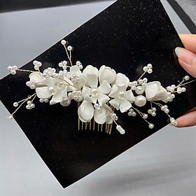 Trâm cài tóc cô dâu thiết kế ngọc trai và hoa 5 canh mềm mại, nữ tính. Tôn lên vẻ đẹp cho mái tóc xinh. Thích hợp trang điểm, make up cô dâu, trang điểm
