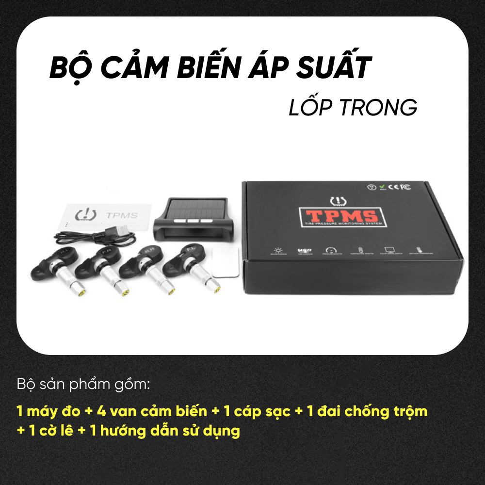 Cảm Biến Áp Suất Lốp Gắn Ngoài TPMS THÔNG SỐ KĨ THUẬT: - Kiểu màn hình: màn hình màu - Kích thước: 95*82*30mmn - Bộ sản phẩm Cảm biến áp suất lốp ô tô TPMS