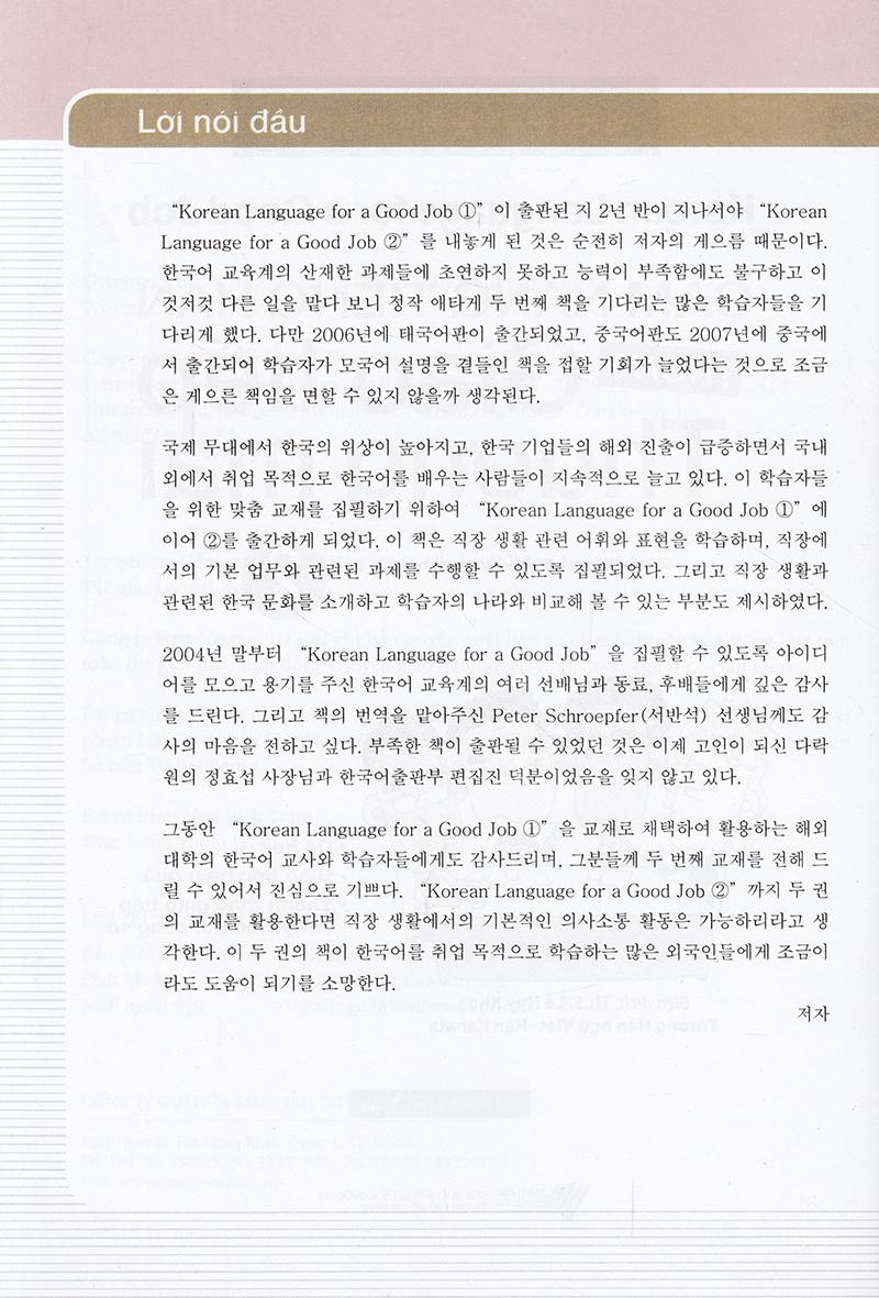 Phong trào học tiếng Hàn bắt đầu bùng nổ từ những năm 1980 và cho đến nay, xu hướng ấy vẫn không ngừng tăng lên. Các sách liên quan đến ngôn ngữ và văn hoá Hàn Quốc cũng được xuất bản ngày càng nhiều. Tuy nhiên, rất khó để tìm những cuốn sách huấn luyện kỹ năng nghề nghiệp dành riêng cho những người đi làm, có lẽ vì không dễ dàng để biên soạn một cuốn giáo trình đáp ứng được mọi ngành nghề và lĩnh vực công việc.