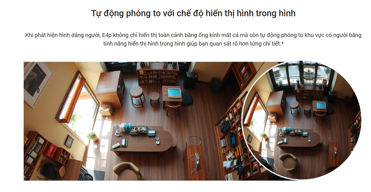 Camera hỗ trợ chế độ xem cận cảnh PiP và chia màn hình đa góc. Bạn có thể chọn chế độ toàn cảnh hoặc tập trung vào khu vực cụ thể. Ứng dụng EZVIZ cho phép điều chỉnh góc nhìn dễ dàng. Tính năng này giúp giám sát linh hoạt, tiện lợi.