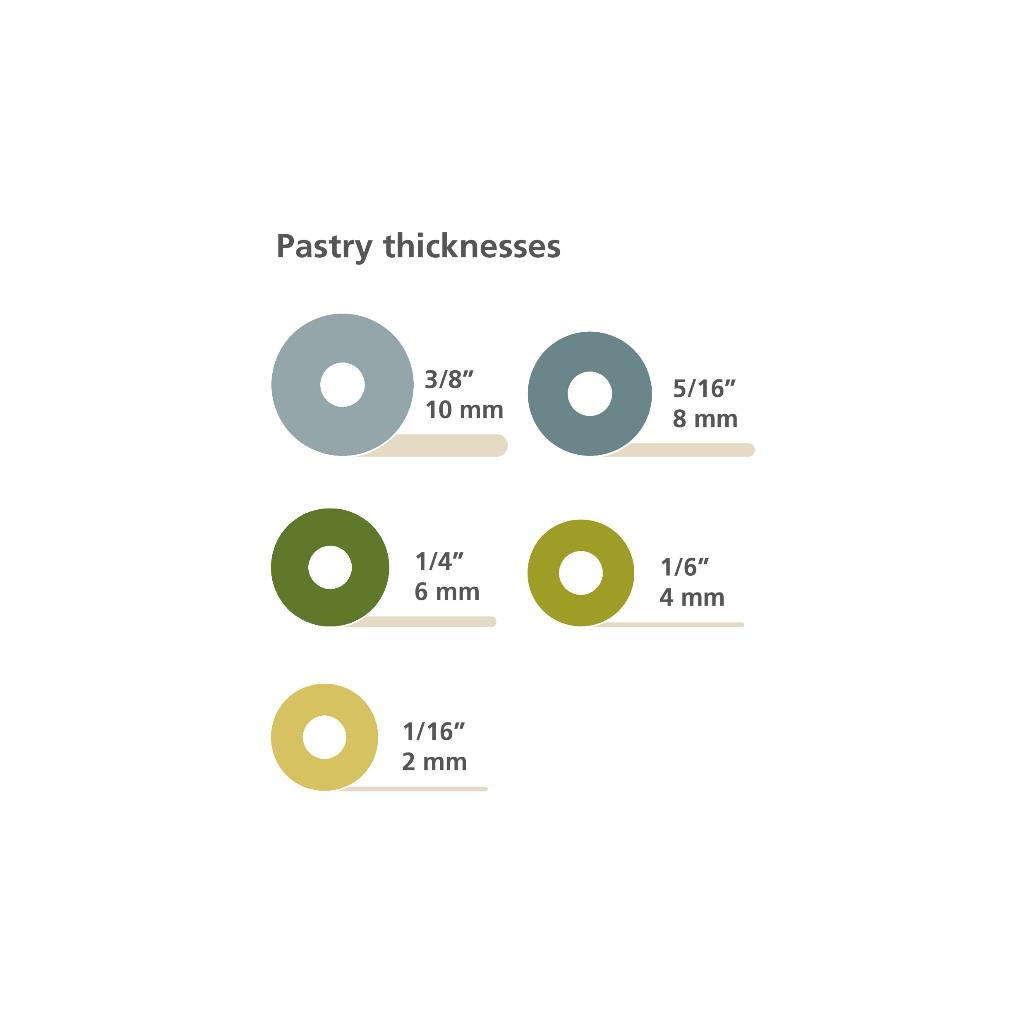 Bất kể độ dày cần thiết là bao nhiêu, cây cán bột có thể điều chỉnh của chúng tôi sẽ giúp bạn cán bột thành phẩm có kích thước hoàn hảo mọi lúc. Nó bao gồm năm bộ vòng có thể tháo rời, được mã hóa màu cho phép bạn nâng bề mặt cán lên 2mm (1/16”), 4mm (1/6”), 6mm (1/4”), 8mm (5/16”) hoặc 10mm (3/8”). Chỉ cần vặn các vòng bạn không cần ra và bạn đã sẵn sàng cán.