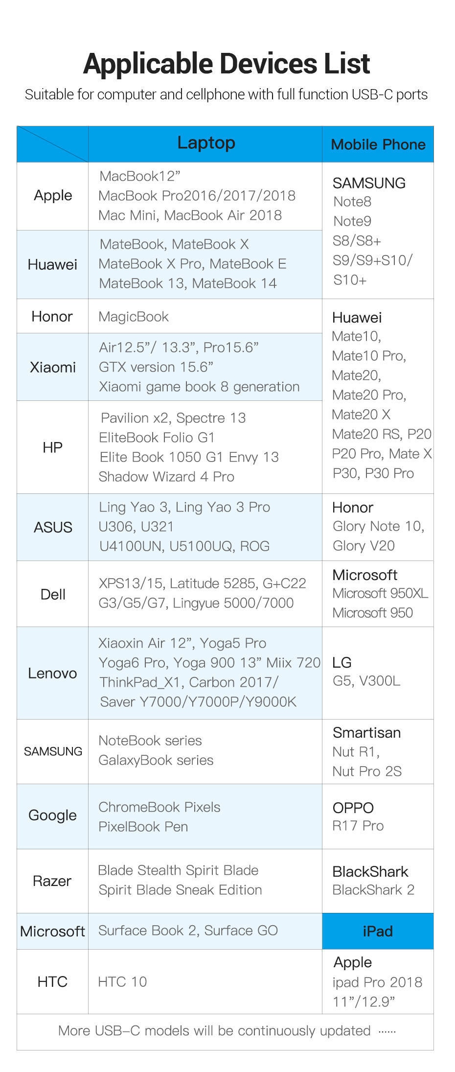 - Cắm và chạy, không cần cài đặt bất kỳ trình điều khiển / phần mềm nào. Tương thích với hầu hết các thiết bị USB C, chẳng hạn như MacBook Pro 2018/2017/2016, MacBook Air 2018, iMac 2018, iPad Pro 2018, Chromebook Pixel, Dell XPS 13/15 , HP Spectre X2 / X360, Acer Spin7, Samsung S8 / S9 +,