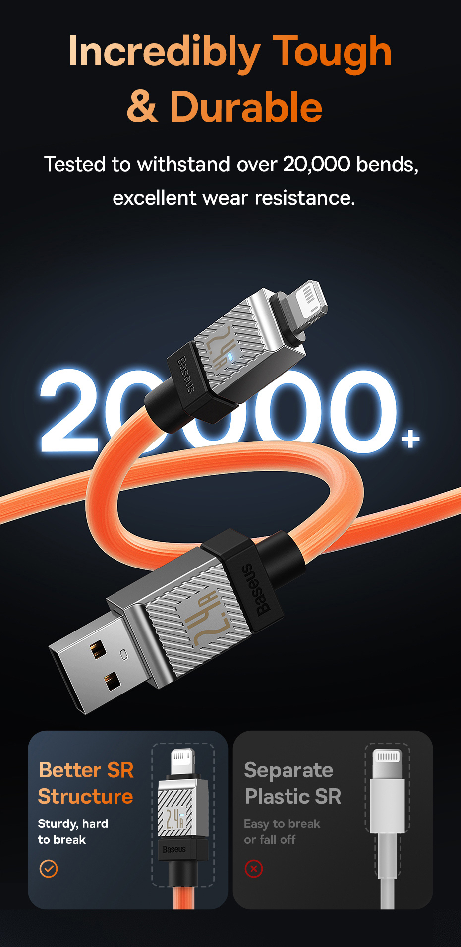 Cáp sạc Baseus CoolPlay Series Fast Charging Cable USB to Lai-nin 2.4A được làm bằng chất liệu cao cấp, bao gồm đồng nguyên chất và vỏ bọc bằng nhựa TPE không độc hại. Vỏ bọc nhựa TPE có đặc tính đàn hồi và chống bám bụi, giúp cáp sạc dễ dàng sử dụng và bảo vệ dây cáp khỏi độ bện và rối. Bên cạnh đó, các đầu kết nối Lai-nin của cáp sạc được làm bằng kim loại chất lượng cao, giúp tăng độ bền và tuổi thọ của sản phẩm.