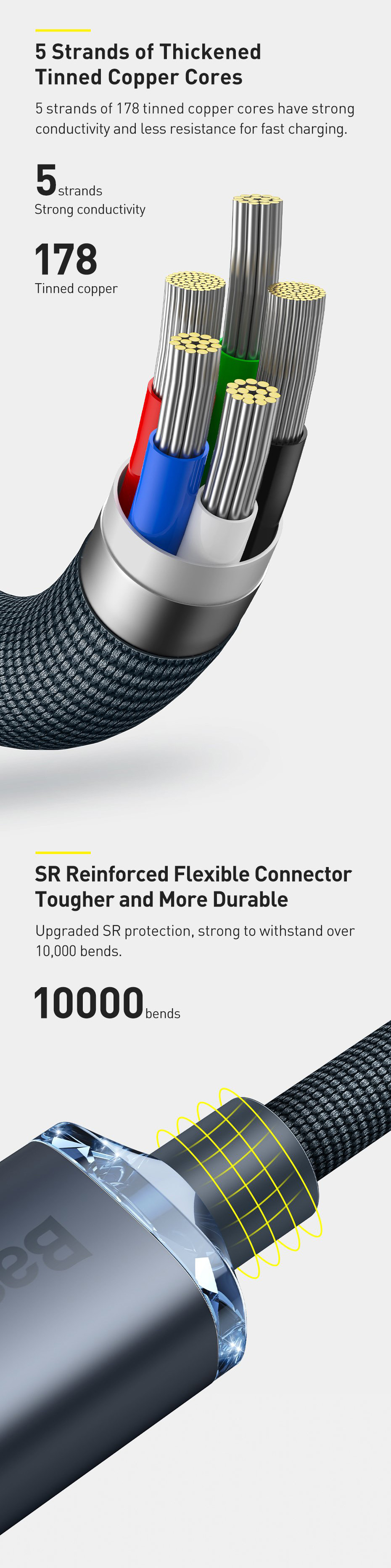 - Thiết kế đẹp và sang trọng, dây cáp được làm bằng sợi nylon siêu bền và đầu cáp là hợp kim nhôm cho kiểu dáng sang trọng.
