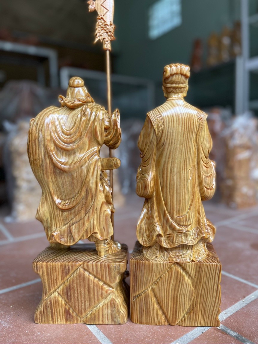 Cặp tượng khổng minh và quan công được làm bằng chất liệu gỗ huyết long liền khối tự nhiên 100%  Kích thước khổng minh 20×8×6cm Kích thước quan công 20×8×6cm Cặp tượng không minh ,quan công được trạm khắc vô cùng tỉ mỉ tinh sảo kỳ công .Đi hầu hết tất cả mọi chi tiết góc ngách nội dung hoa văn của tượng đều được ngọt tỉa chỉnh sửa hoàn toàn bằng tay thủ công .Đồng thời cặp tượng được kiểm định kỹ như cho vào thẩm sấy cho gỗ khô kiệt .Mục đích trống dập nứt vênh mo mối mọt .Kết hợp với trà nhám ,đánh giấy giáp nhiều lần cho sạch sẽ ,sờ mát lạnh rồi cho vào phun lót làm ,bóng mờ để giữ lại mầu sắc vân gỗ tự nhiên .Tượng được làm và hoàn thiện do bàn tay khối óc tài hoa ,Từ những người thợ giàu kinh nghiệm ,Cũng như tay nghề cao trong làng nghề truyền thống .Chính vì thế cặp tượng đã đáp ứng đầy đủ những tiêu trí ( Đẹp bền rẻ ) Thẩm mỹ nghệ thuật với chất lượng tuyệt vời