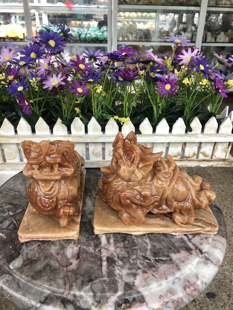 Hợp mệnh Thổ - Kim Chất liệu: Đá cẩm thạch vàng cà rốt Kích thước: Dài 15 cm X Rộng 6 cm x Cao 12,5 cm Khối lượng: 3,2 kg / cặp Ý nghĩa Tỳ