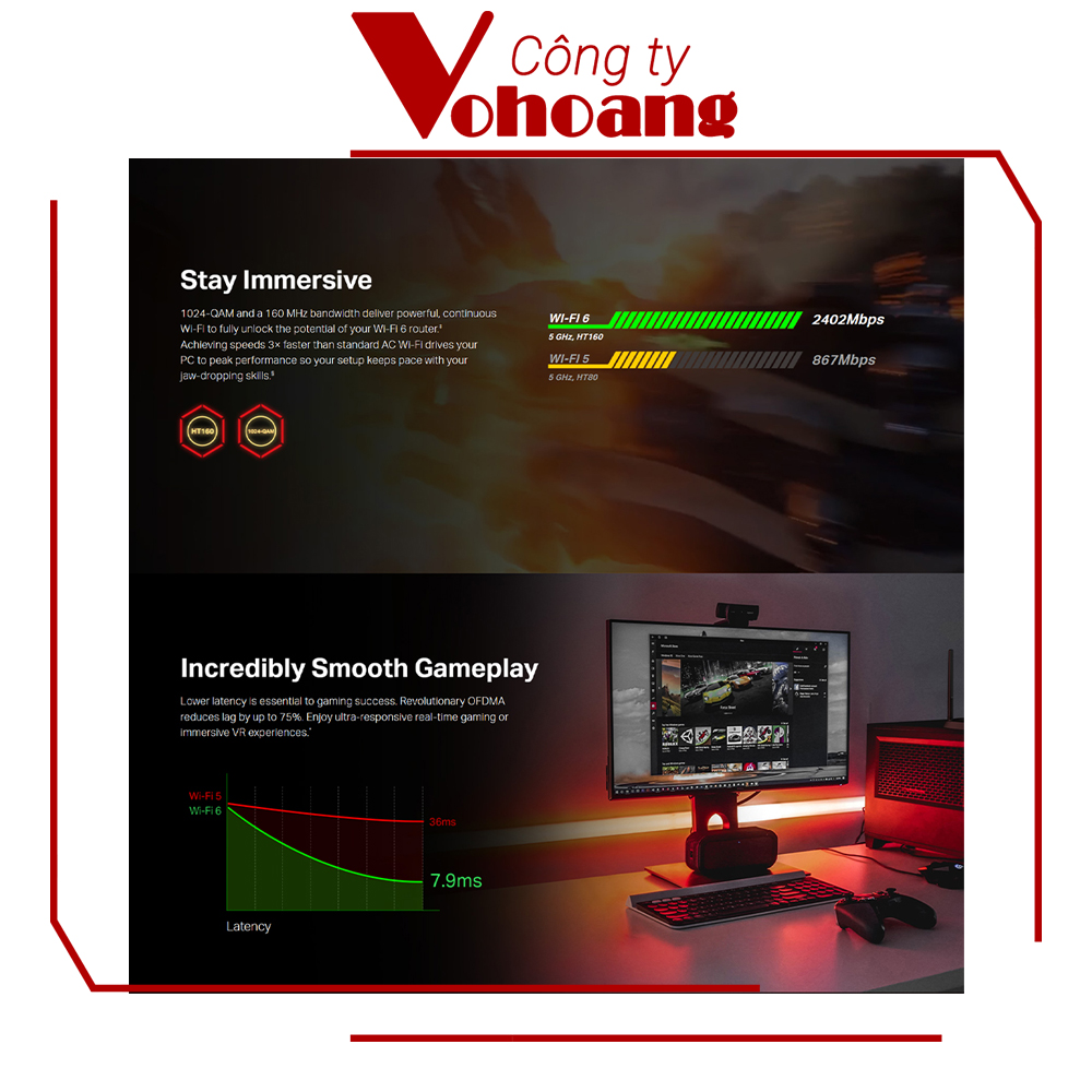 Sử dụng nền tảng Wi-Fi 6, Card mạng Wireless TP-Link Archer TX3000E được thiết kế để giải phóng việc chơi game của bạn khỏi dây cáp LAN vướng víu. Chuẩn Wi-Fi 6 mới nhất đảm bảo tốc độ cao với độ trễ cực thấp và kết nối không bị gián đoạn.