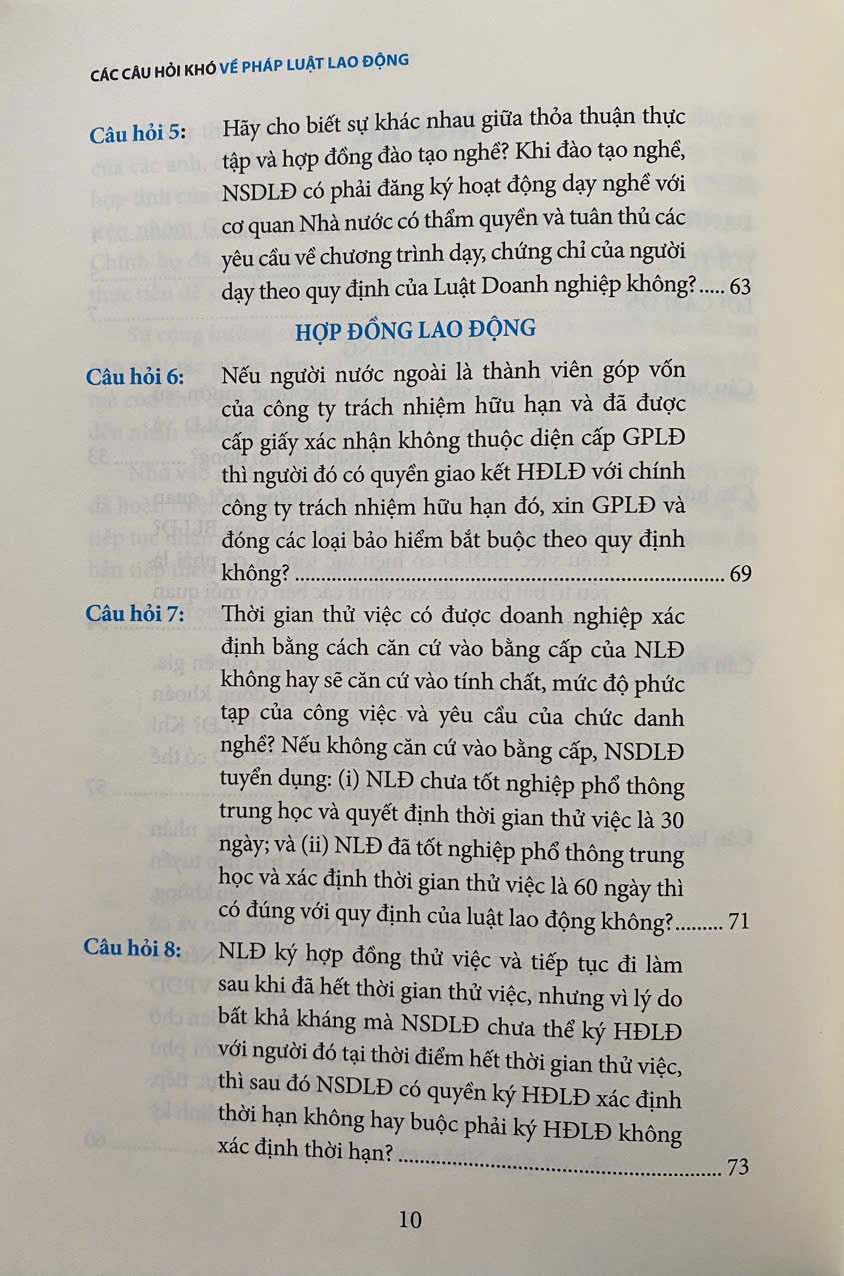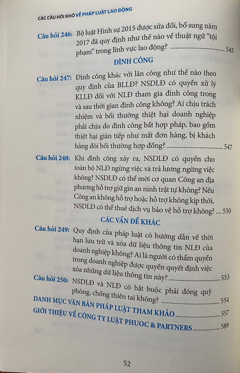 Hiểu đúng và áp dụng đúng luật lao động là thách thức lớn đối với doanh nghiệp. Trong thực tế, nhiều tình huống phức tạp phát sinh mà không phải lúc nào doanh nghiệp, người lao động cũng được xử lý đúng cách. Đó là lý do quyển sách "Các Câu Hỏi KHÓ Về Pháp Luật Lao Động" ra đời. Thông qua quyển sách, Luật sư Nguyễn Hữu Phước giải đáp những vấn đề khó khăn, hướng dẫn doanh nghiệp, người lao động hiểu rõ và biết cách áp dụng pháp luật lao động một cách hiệu quả vào thực tiễn. Đây là phiên bản cập nhật từ quyển "Các Câu Hỏi Thường Gặp Trong Pháp Luật Lao Động" với những điểm mới như: Giải đáp câu hỏi về dữ liệu điện tử và bảo vệ dữ liệu cá nhân theo Nghị định 13/2023/NĐ-CP. Trả lời những câu hỏi về Luật Bảo hiểm Xã hội 2014 với quyền lợi cho người lao động, bổ sung quy định xử lý tình trạng chậm đóng, trốn đóng BHXH, sửa đổi quy định về trợ cấp hưu trí xã hội,... Giải đáp thắc mắc về việc tuyển dụng, sử dụng lao động nước ngoài và những thủ tục liên quan....  Quyển sách phù hợp với: Chủ doanh nghiệp, những người làm Nhân sự, người lao động, luật sư nội bộ doanh nghiệp, luật sư tư vấn cho doanh nghiệp,... Luatvietbook xin trân trọng giới thiệu cuốn sách đến bạn đọc!