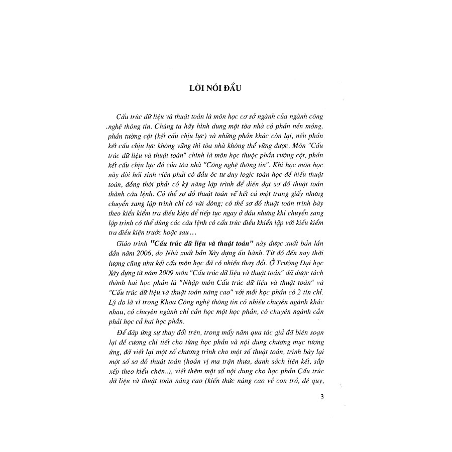 Với thời lượng để giảng dạy trong 60 tiết, cuốn sách chỉ đề cập được một số vấn đề cơ bản trong lĩnh vực “Cấu trúc dữ liệu và Thuật toán” – một môn học có ý nghĩa quan trọng trong hành trang kiến thức của sinh viên ngành Công nghệ Thông tin.