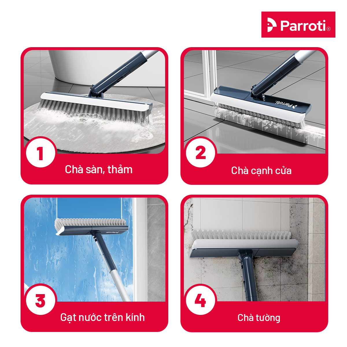 - Bước 4: Quay đầu thanh gạt cao su để gạt nước hoặc chất bẩn trên sàn. – Bước 5: Làm sạch đầu chổi và cất giữ bằng cách treo hoặc dựng góc tường. (*) Lưu ý: Bạn có thể tham khảo kỹ hơn ở video mô tả sản phẩm hoặc đừng ngần ngại liên hệ Parroti để được hướng dẫn và hỗ trợ một cách tốt nhất.