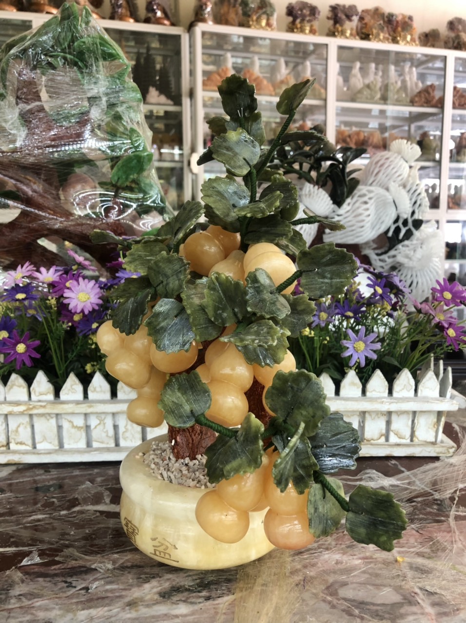 Chất liệu: Quả đào bằng đá thạch anh hồng, lá và chậu cây là đá ngọc Ấn Độ Bao gồm: 28 quả Kích thước: Cao 50 cm x Ngang 34 cm Khối lượng: 6 kg