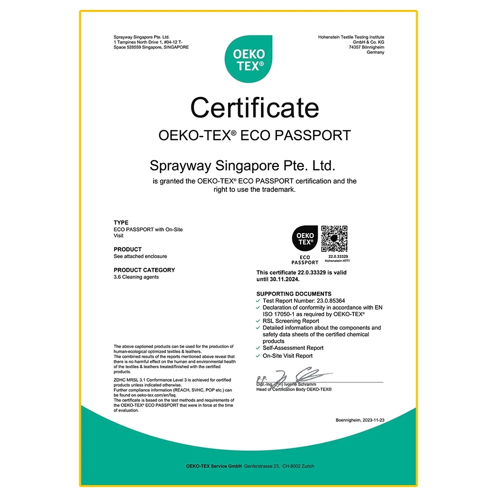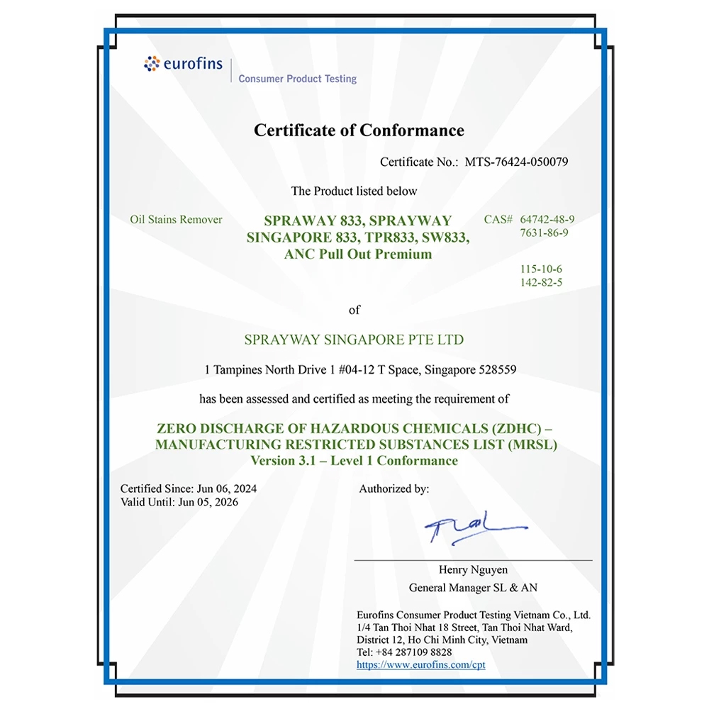 Chất tẩy không chứa chất Chlorinated, đạt tiêu chuẩn về an toàn môi trường. Đặc biệt, tất cả các sản phẩm Spot-lifter 833 của chúng tôi đều đạt chứng nhận OEKOTEX 3.6 & ZDHC 3.1