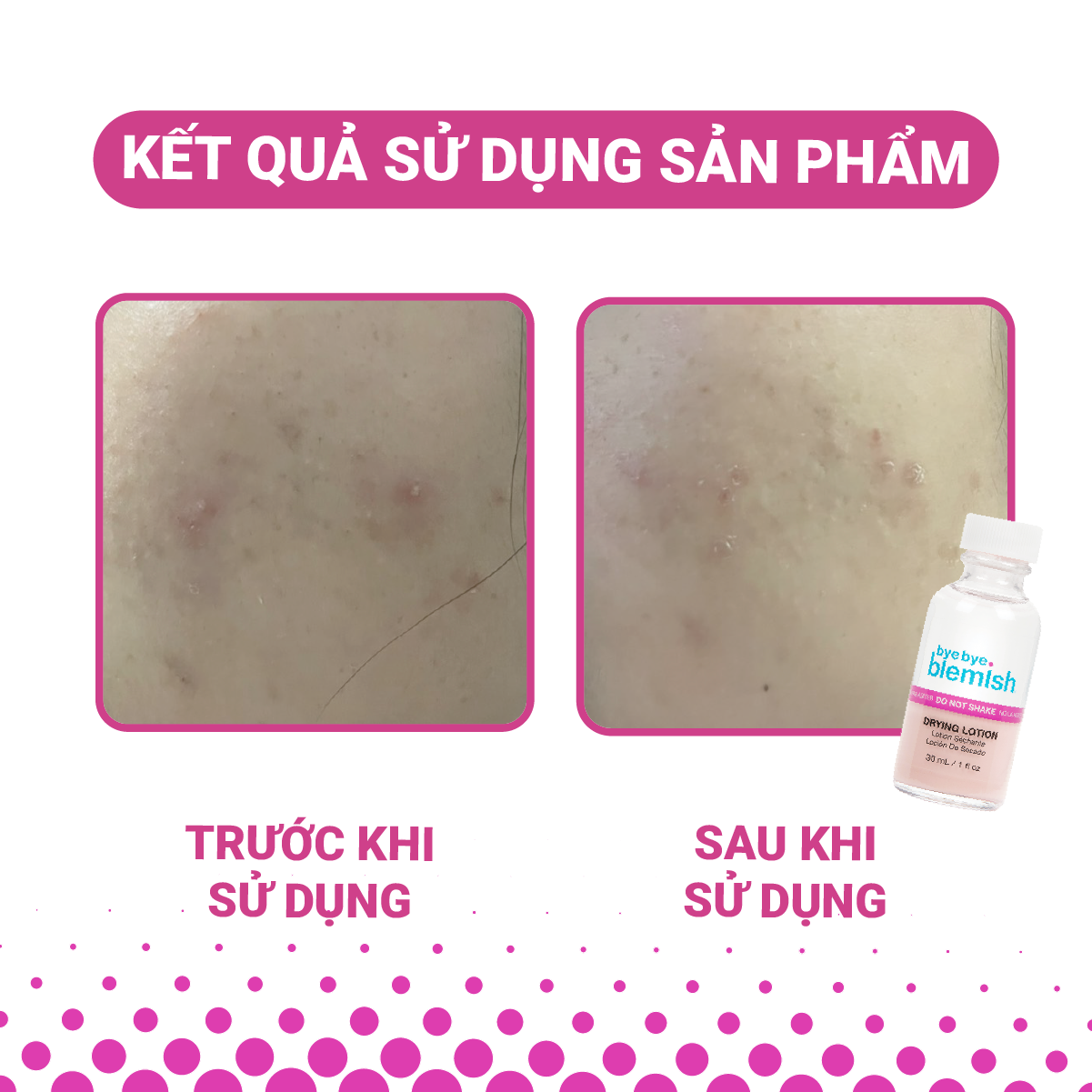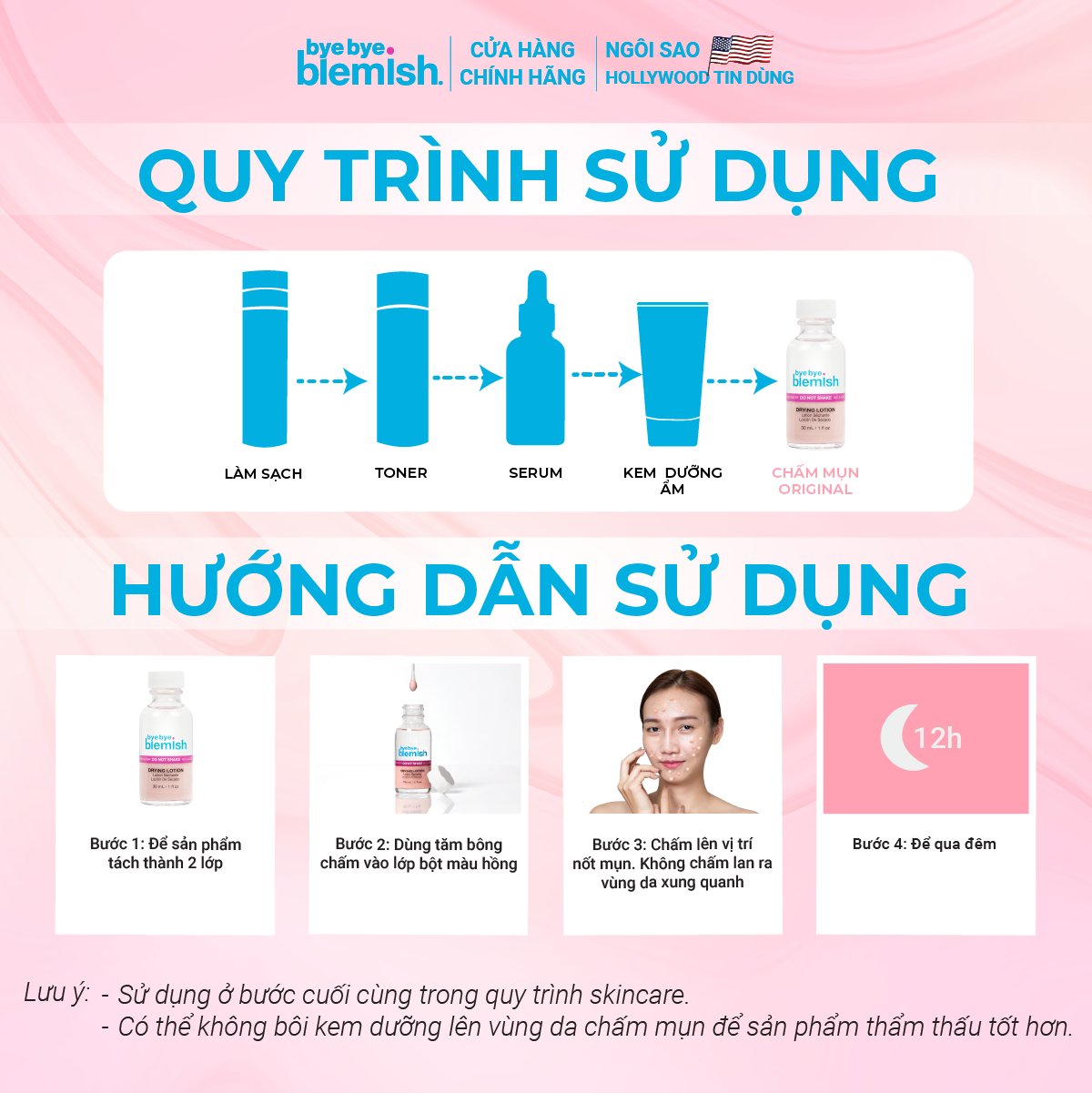 - Không chất độc hại, không thử nghiệm trên động vật. LƯU Ý: - Kết quả thực tế nhanh hay chậm có thể phụ thuộc vào mức độ của nốt mụn và quá trình chăm sóc da hằng ngày. - Sản phẩm này không phải là thuốc và không có chức năng thay thế thuốc chữa bệnh. HƯỚNG DẪN SỬ DỤNG Bước 1: Không lắc sản phẩm. Để dung dịch tách thành 2 lớp rõ ràng. Bước 2: Vệ sinh sạch da bằng sữa rửa mặt. Bước 3: Nhúng tăm bông vào lớp bột màu hồng. Bước 4: Chấm mụn trực tiếp lên các nốt mụn, không chấm lan ra xung quanh. Bước 5: Để qua đêm. Lưu ý: Sử dụng ở bước cuối cùng trong quy trình skincare. THÀNH PHẦN Salicylic Acid 1,5%, Zinc oxide 9%, Water (Aqua), Camphor, Magnesium Aluminum Silicate, Iron Oxides (C177491), Sulfur, Isopropyl Alcohol. THÔNG TIN THƯƠNG HIỆU - Bye Bye Blemish là thương hiệu mỹ phẩm đến từ Mỹ, thuộc công ty American International Industries.