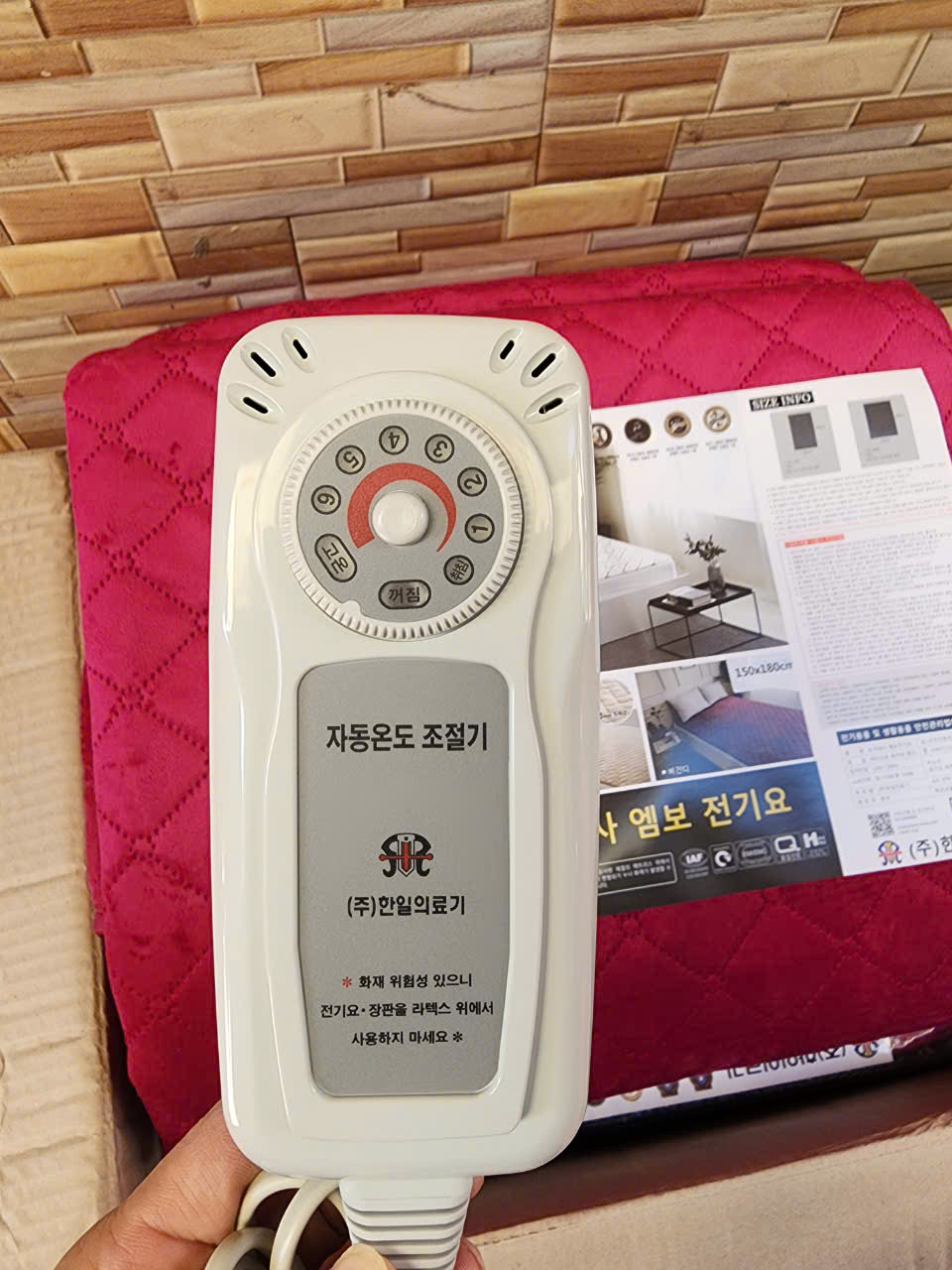 - Chất liệu nhung nỉ , màu đỏ đô. đệm sưởi Hàn Quốc giúp đảm bảo độ ấm tuyệt vời cho cơ thể vào những đêm đông giá rét; giúp loại bỏ ẩm thấp nơi giường nằm, đảm bảo cho giường nệm luôn khô ráo và ấm áp. Chăn điện rất tốt cho sức khỏe người dùng, tốt hơn khi dùng cho người già và những người bị chứng đau lưng mỏi cơ, thấp khớp Khuyến cáo khi sử dụng đệm điện Hàn Quốc: Khi khởi động cắm chặt đầu giắc vào chăn, chỉnh điều khiển về số 4 hoặc 5 tầm 7 đến 10 phút là nóng đều, thì điều chỉnh số về 1 SỐ 2 theo thời tiết. - Khi gấp chăn không nên để bộ điều khiển nhiệt ra ngoài mà nên để trong lòng chăn để đảm bảo tuổi thọ cho bộ điều khiển.