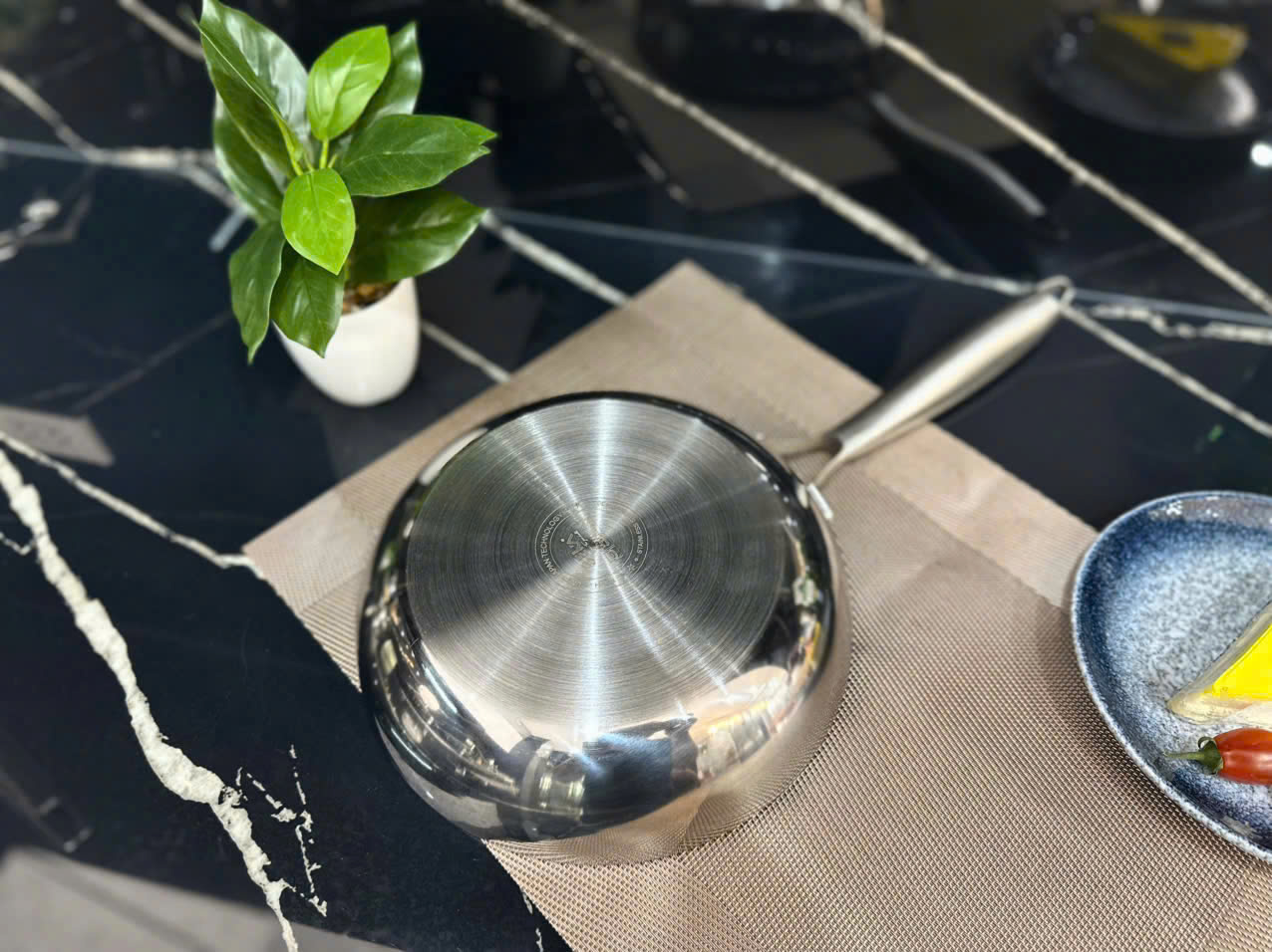 Không sử dụng lớp chống dính, đáy liền nguyên khối dầy dặn, dễ dàng vệ sinh. Không kén bếp, nhiệt lớn, cán chảo inox không bị nóng khi dùng với bếp từ.