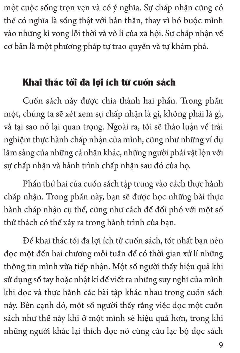 Cuốn sách được chia làm hai phần. Phần một sẽ đưa bạn đọc xem xét và tìm hiểu thế nào là chấp nhận, tại sao sự chấp nhận là quan trọng và cung cấp cho độc giả những ví dụ lâm sàng của những cá nhân khác - những người đang phải vật lộn với sự chấp nhận và hành trình sau đó của họ. Phần thứ hai của cuốn sách sẽ tập trung vào cách thực hành chấp nhận qua các bài thực hành cụ thể, cũng như cách để đối phó với những thử thách có thể xảy ra trên hành trình của bạn.