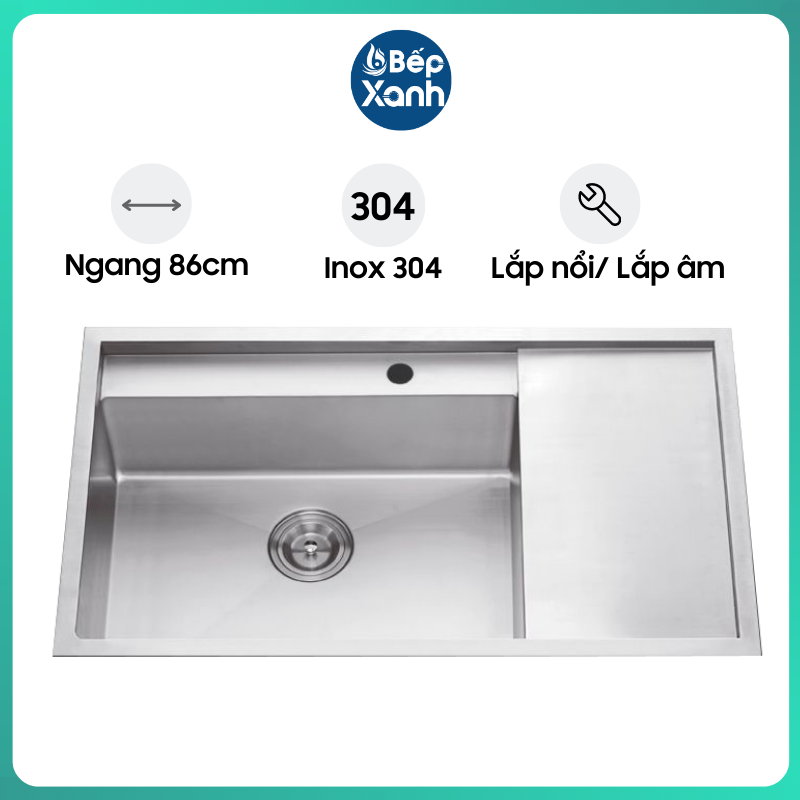 Dòng sản phẩm có thể lắp âm Bảo hành: 5 năm Chất liệu: Inox Độ dày: 0.8 mm Độ sâu bồn: 240 mm Kích thước: 820D x 450R mm Đóng gói: 1 bộ tiêu chuẩn