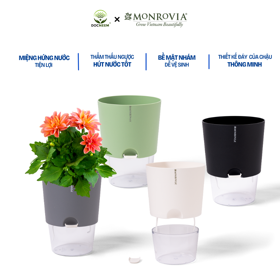 DOCNEEM XIN GIỚI THIỆU ĐẾN BẠN MÃ SẢN PHẨM - CHẬU TRỒNG CÂY TỰ TƯỚI THÔNG MINH MONROVIA H0 _ Chất liệu: PP cao cấp _ Cấu tạo: Chậu bao gồm hai lớp chậu *