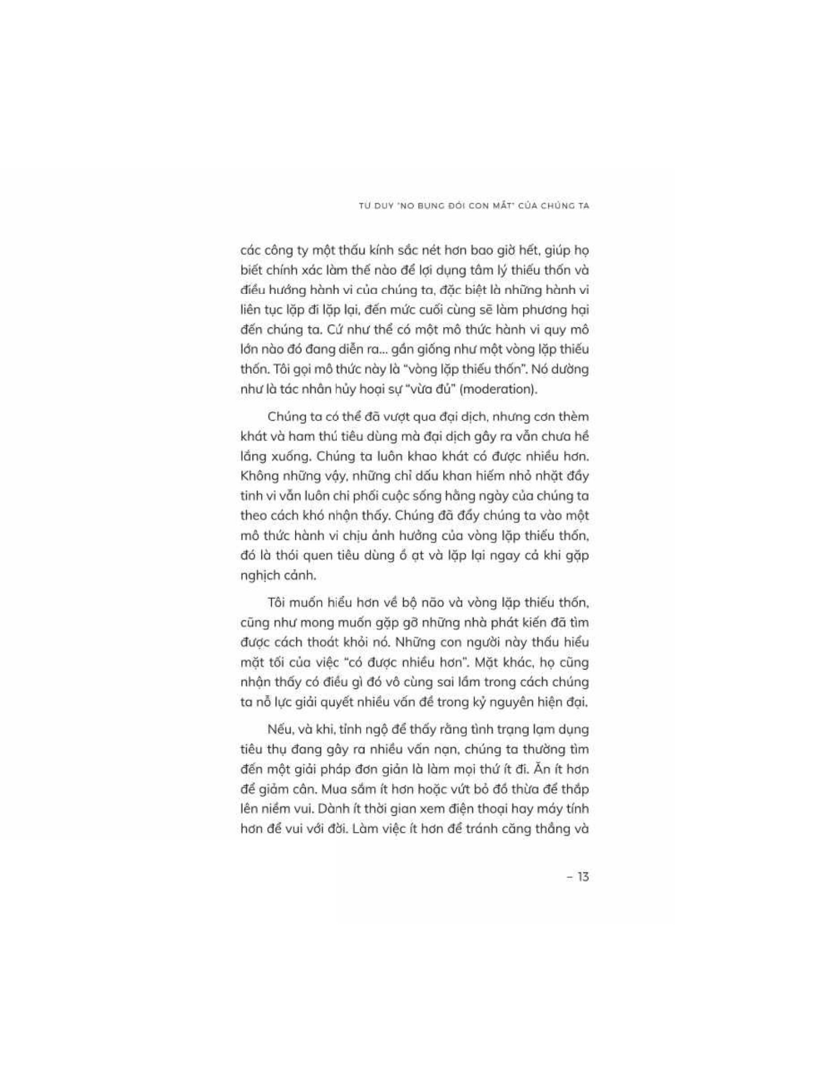 Cuốn sách đi sâu vào khoa học đằng sau những ham muốn này, rút ra từ khoa học thần kinh, tâm lý học và nhân chủng học. Cuốn sách cũng đưa ra những phương pháp đơn giản giúp chúng ta hướng tới lối sống “vừa đủ”, củng cố những thói quen lành mạnh và sống trọn vẹn cũng như trân trọng những gì mình có, bao gồm: