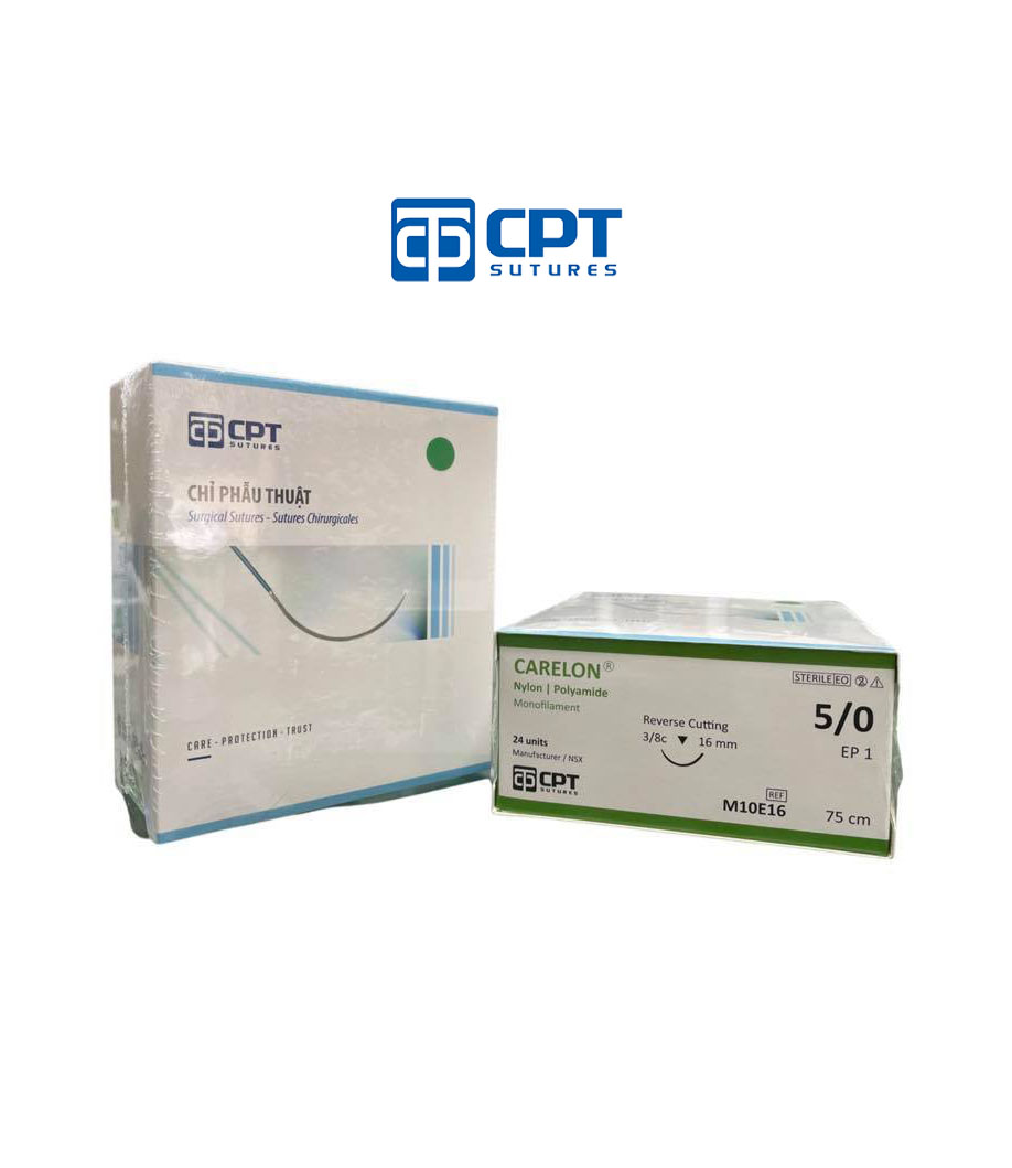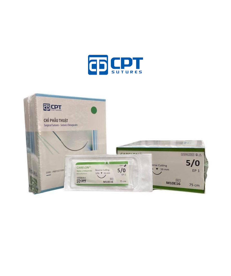 1. Chỉ phẫu thuật không tiêu CPT Carelon Nylon: size cỡ chỉ: 5/0 USP, dài 75 cm, kim tam giác 3/8c, dài 13 mm, mã hàng: M10E13. 2. Chỉ phẫu thuật không tiêu CPT