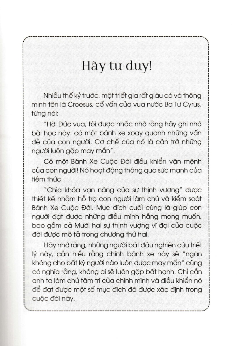 Do đó, sở hữu Chìa khóa vạn năng, bạn đọc có thể mở ra các giải pháp cho mọi vấn đề mình gặp phải, dễ dàng chuyển hóa những thất bại trong quá khứ thành những tài sản vô giá và đạt được Mười Hai Tài Sản Vĩ Đại, trong đó có cả đảm bảo tài chính.