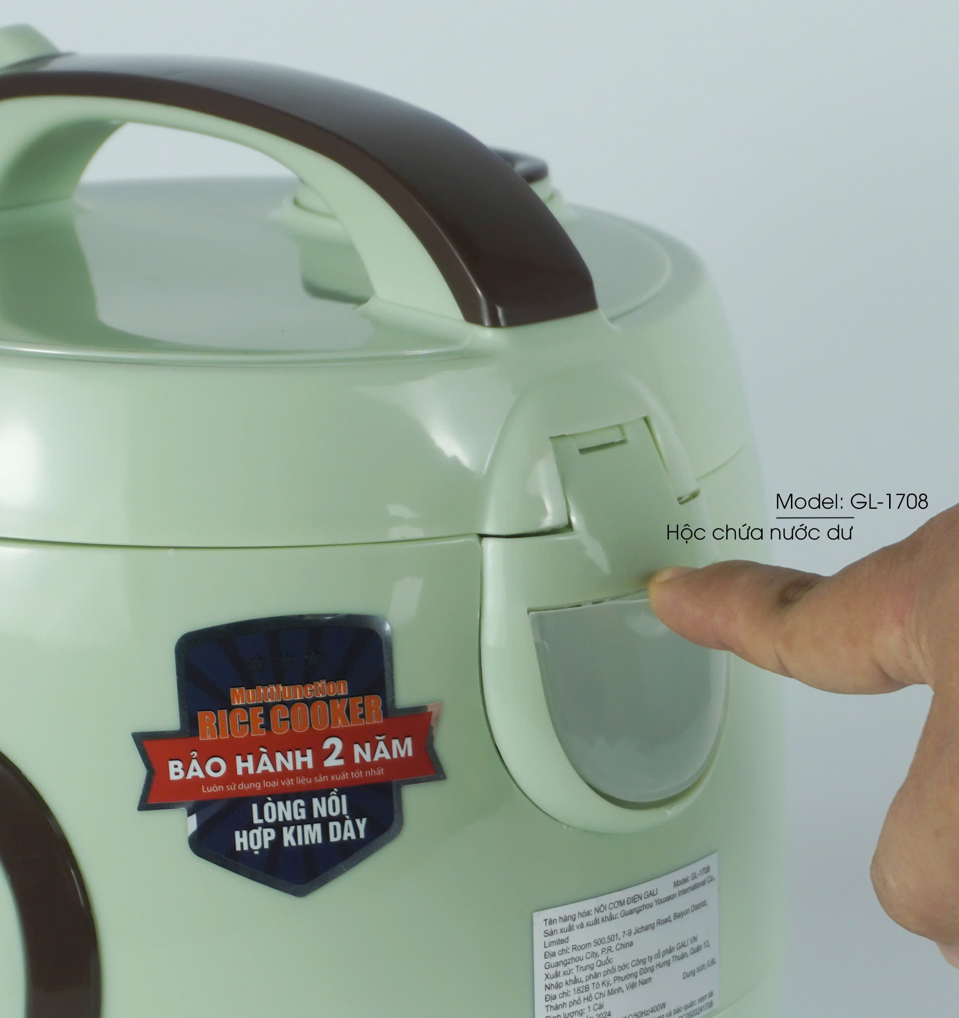 Nồi cơm điện GALI GL-1708 0.8 lít với tông màu xanh lá cây, được thiết kế để nâng tầm trải nghiệm ẩm thực của bạn đồng thời tô điểm thêm sắc màu cho căn bếp.