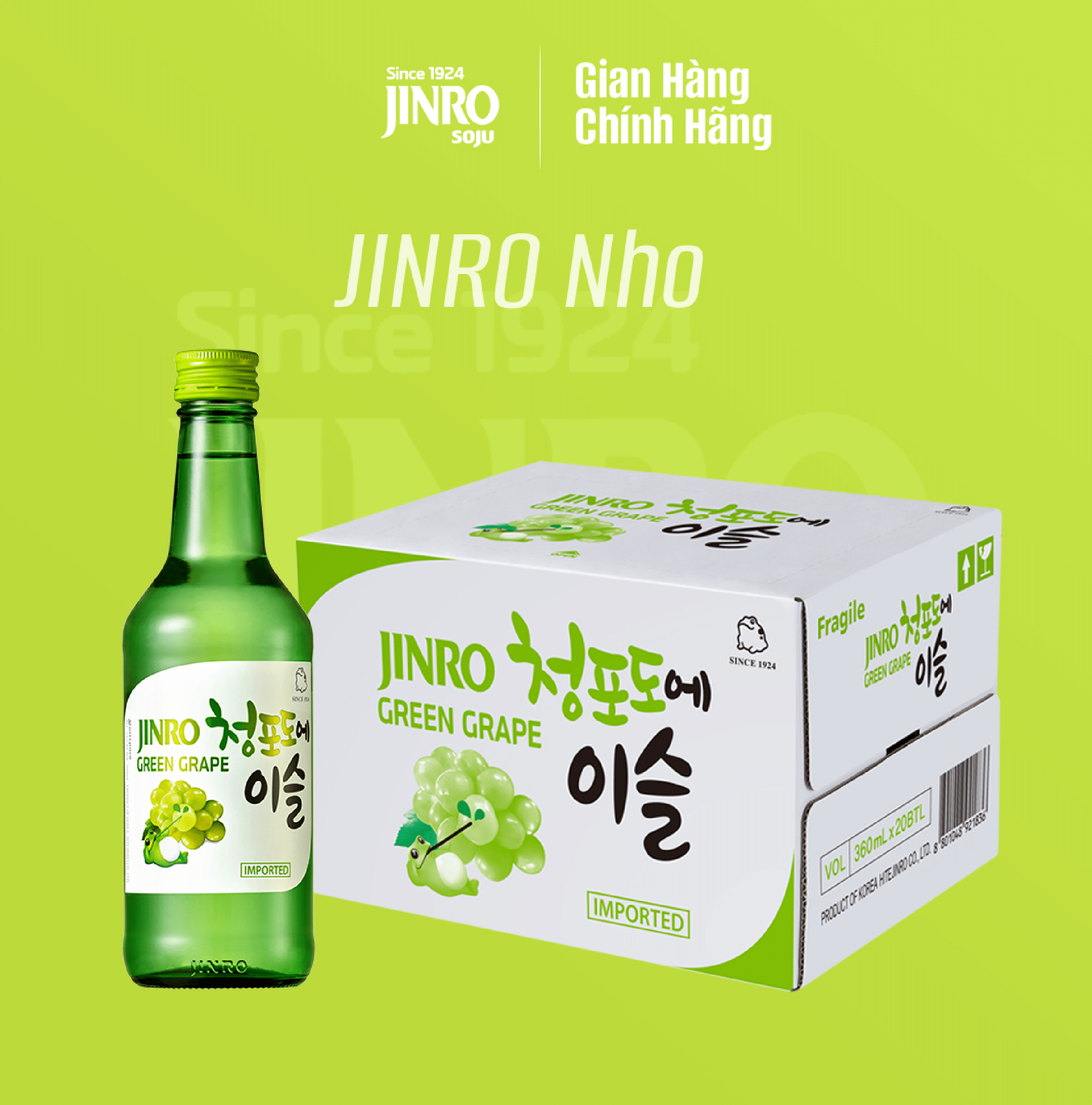 Mua tại TiktokĐược sản xuất từ nguyên liệu tự nhiên hảo hạng với hương vị nho xanh Hàn Quốc, Soju Hàn Quốc Jinro vị nho mang đến sự hòa quyện giữa vị ngọt tinh túy và hương thơm mê say Thành phần cấu tạo: Gạo, nước, đường, men được lọc qua lớp than tre hoạt tính, hương nho tự nhiên Dung tích: 360ml Nồng độ: 13% Thời hạn sử dụng: Không có thời hạn sử dụng Hướng dẫn sử dụng: Dùng trực tiếp, ngon hơn khi ướp lạnh Hướng dẫn bảo quản: Soju phải được bảo quản ở điều kiện nơi khô mát, đảm bảo an toàn vệ sinh và tránh ánh nắng trực tiếp Xuất xứ: Hàn Quốc Sản xuất tại: HITEJINRO CO., LTD **Cảnh báo: Trẻ vị thành niên, phụ nữ trong giai đoạn mang thai và cho con bú không nên sử dụng đồ uống có cồn.