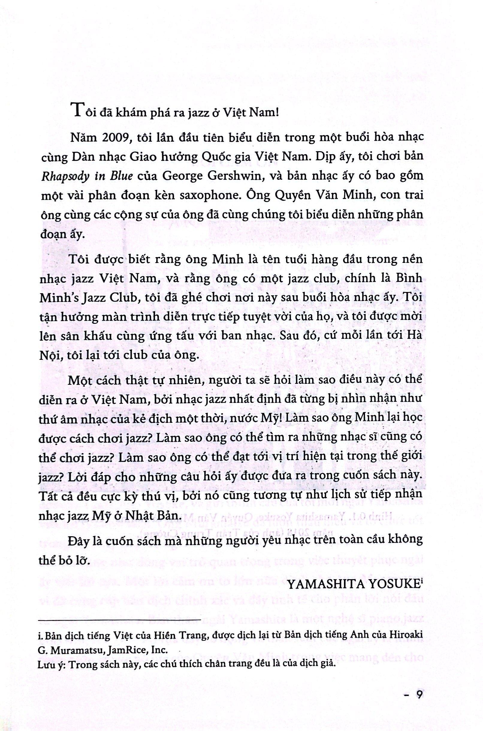 Mua tại TiktokJazz - một thể loại âm nhạc bắt nguồn từ cộng đồng người châu Phi ở Hoa Kỳ vào cuối thế kỷ 19 - đầu thế kỷ 20, đã lan ra khắp thế giới và hiện diện ở mọi nền văn hóa âm nhạc quốc gia. Nhạc jazz mang đậm tính nghệ sĩ, đầy nét đặc trưng và khiến những thính giả khi đã thích rồi sẽ như một kẻ si tình với nó. Ở Việt Nam, jazz cũng có rất nhiều câu chuyện riêng, kiến thức “nhập môn” riêng để khám phá, như người Việt chơi jazz ở Việt Nam là ai? Họ học chơi jazz ở đâu, bằng cách nào? Có thật là họ “chơi jazz” không? Những câu hỏi ấy sẽ được giải đáp trong Chơi jazz ở Việt Nam: Quyền Văn Minh và nhạc jazz Hà Nội - cuốn sách kể lại cuộc hành trình jazz ra đời ở Việt Nam, tập trung vào câu chuyện của nghệ sĩ Quyền Văn Minh - người đã tận hiến đời mình cho việc phát triển jazz ở mảnh đất quê hương, để thuật lại sống động cách mà nhạc jazz được nghe, được học và được biểu diễn ở nơi này. Không phải một bài phỏng vấn tiêu chuẩn mà ta vẫn thường đọc trên báo chí, nội dung cuốn sách như góp nhặt từ những lần ngồi xuống tâm tình, hàn huyên cùng một người bạn đáng tin cậy, để từ chuyện đời mà nghe ra chuyện nhạc, chuyện jazz. Tác phẩm là bước đệm cho những nghiên cứu và hiểu biết sâu hơn về nhạc jazz ở Việt Nam. ĐÁNH GIÁ/NHẬN XÉT CỦA CHUYÊN GIA “Đây là cuốn sách mà những người yêu âm nhạc trên toàn cầu không thể bỏ lỡ”. - Yamashita Yosuke TRÍCH ĐOẠN HAY