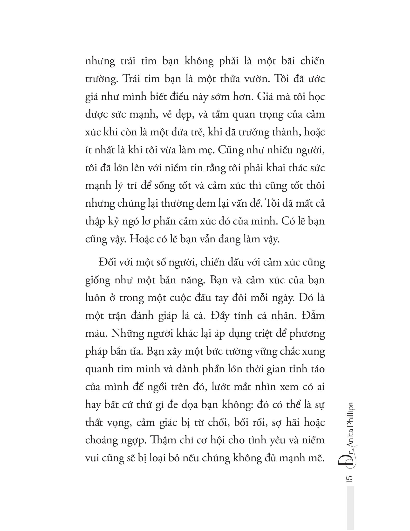 Trong cuốn sách này, nhà trị liệu chấn thương và chuyên gia sức khỏe, Tiến sĩ Anita Phillips, sẽ chỉ ra cho chúng ta thấy rằng việc đón nhận cảm xúc là chìa khóa để sống cuộc sống của bạn mạnh mẽ nhất. Giống như những khu vườn phát triển trên nền đất tốt, cuộc sống dồi dào mà bạn hằng tìm kiếm chỉ có thể nảy nở trên mảnh đất trái tim bạn.