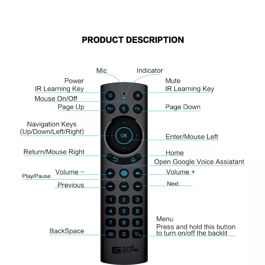 1 . Điều khiển G20S Pro BT là phiên bản có cả kết nối bluetooth , kết nối không dây 2.4G và hồng ngoại ., tương thích với hầu hết các thiết bị android , có 2 phím có thể học lệnh hồng ngoại được là nút nguồn và nút mute .