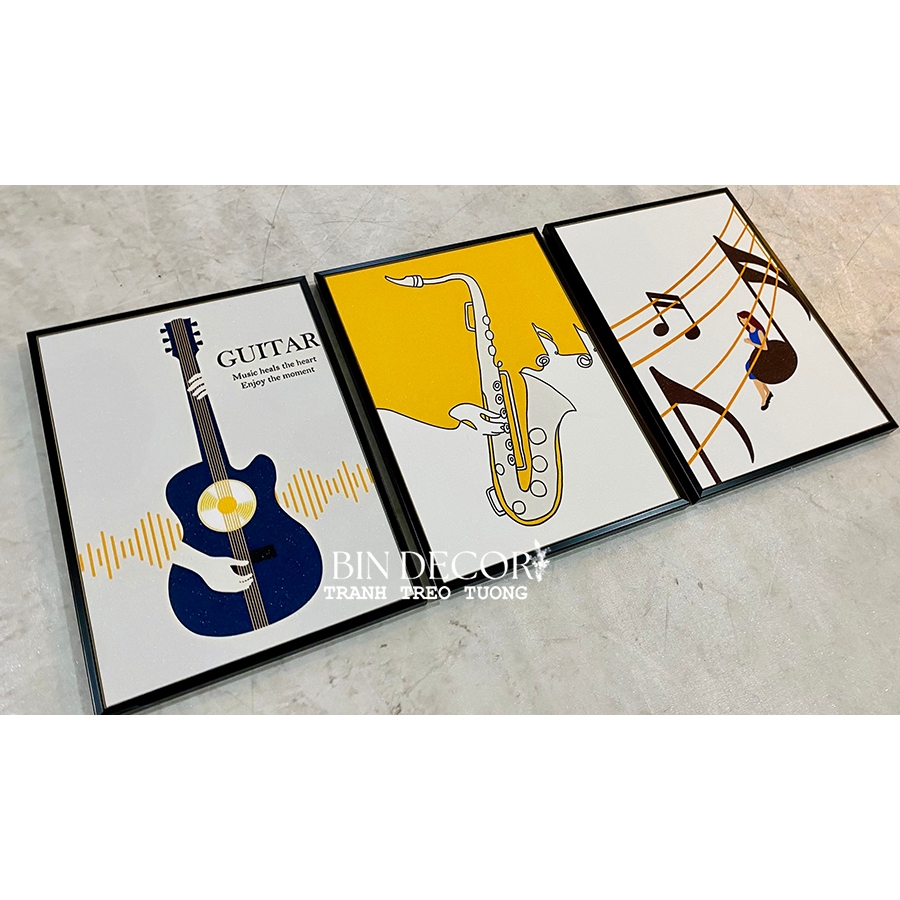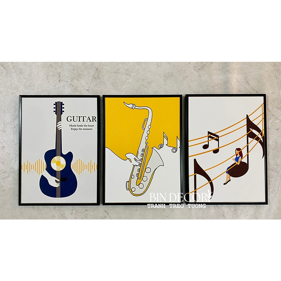 Tranh treo tường âm nhạc 24 - Kích thước của tranh : Kích thước : 25x35cmx3 tấm 30x45cmx3 tấm 40x60cmx3 tấm - Chất liệu : KIM SA - TRÁNG GƯƠNG - CANVAS - Khách hàng