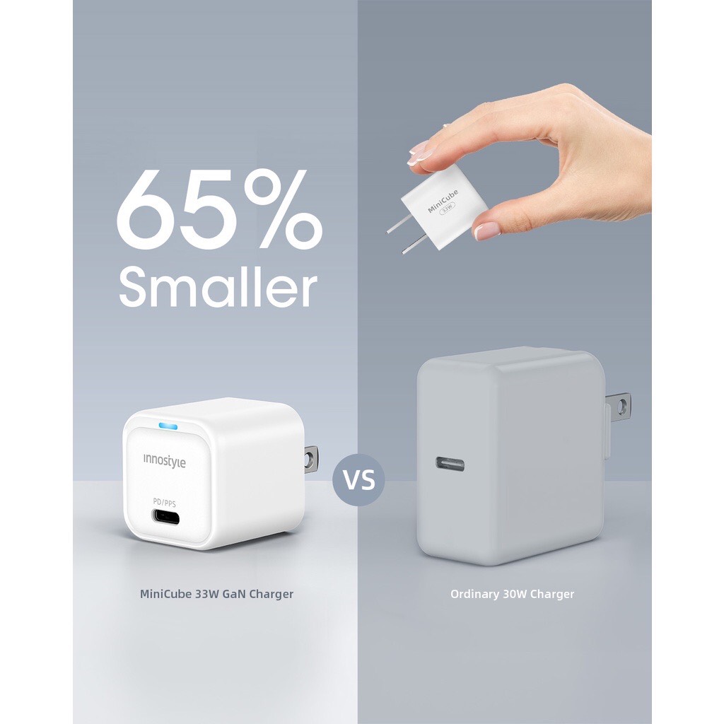 Mua tại TiktokCốc sạc Innostyle MiniCube 33W GaN Charger IC33PDWHI dành cho iPhone, Samsung- Hàng chính hãng Bộ sạc siêu nhỏ lên tới 33W Sạc nhanh bất kỳ thiết bị USB-C nào, tương thích 100% với công suất cao nhất cho IPHONE 12/13 SERIES, IPAD, MACBOOK AIR 13″ 2020 với công suất PD 20/30W, PPS 25W