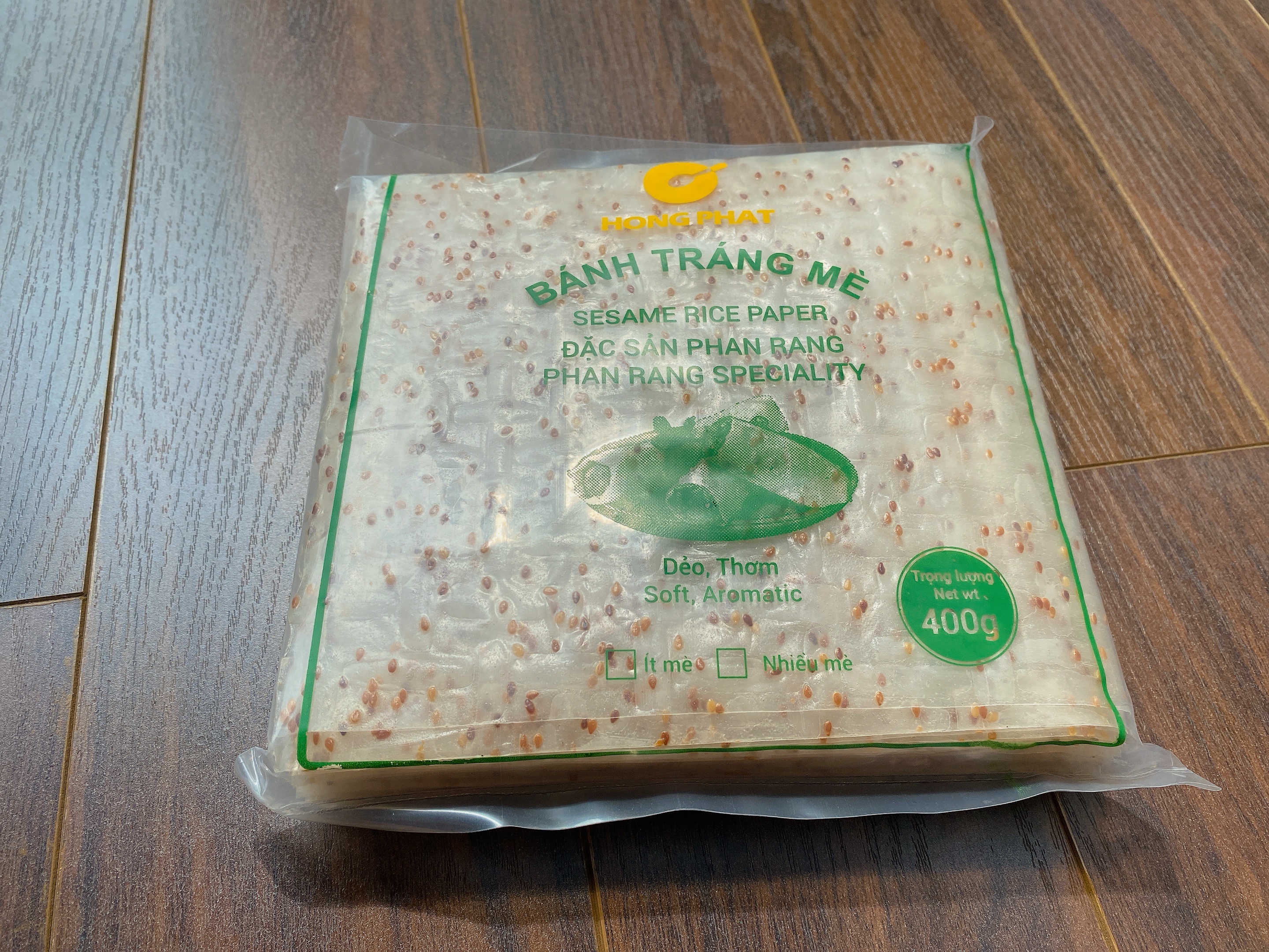 Bánh tráng mè, bánh tráng gỏi cuốn mè Hồng Phát đặc sản Phan Rang gói 400g Sản phẩm làm từ Gạo, bột khoai mì, muối và hạt mè. Nhúng đẫm bánh tráng vào nước. Bánh