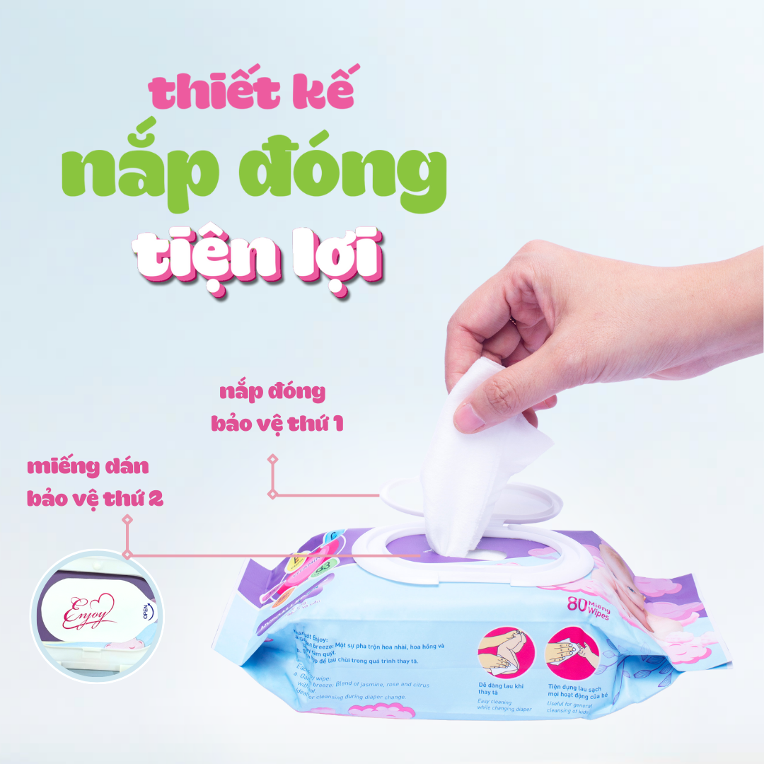 COMBO 5 Khăn ướt em bé ENJOY mềm mại, dưỡng ẩm, tiện dụng, đạt chuẩn sức khỏe SGS - Gói 20/50/80 tờ Khăn ướt baby Enjoy được sản xuất với thành phần hoạt chất thiên