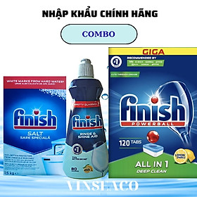 Combo: Viên rửa bát Finish All in one 100 viên +Dung dịch Nước làm bóng finish 750ml +Muối rửa bát finish 1.5kg cho Máy rửa bát chén là bộ 3 sản phẩm đầy đủ chức