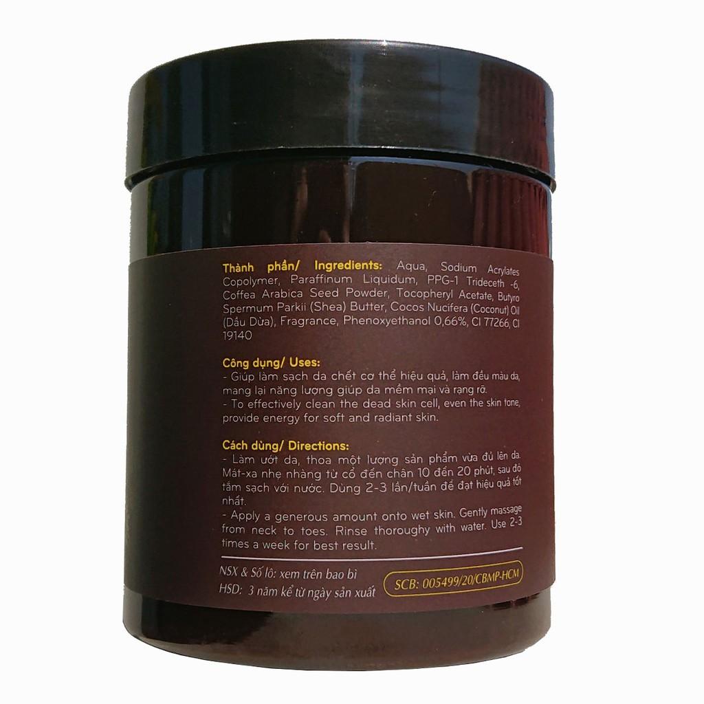 Sản phẩm được tạo từ những hạt cà phê Đăk Lăk nguyên chất xay nhuyễn, hòa quyện cùng bơ cacao Tiền Giang giúp làm sạch tế bào chết hiệu quả, làm đều màu da, mang